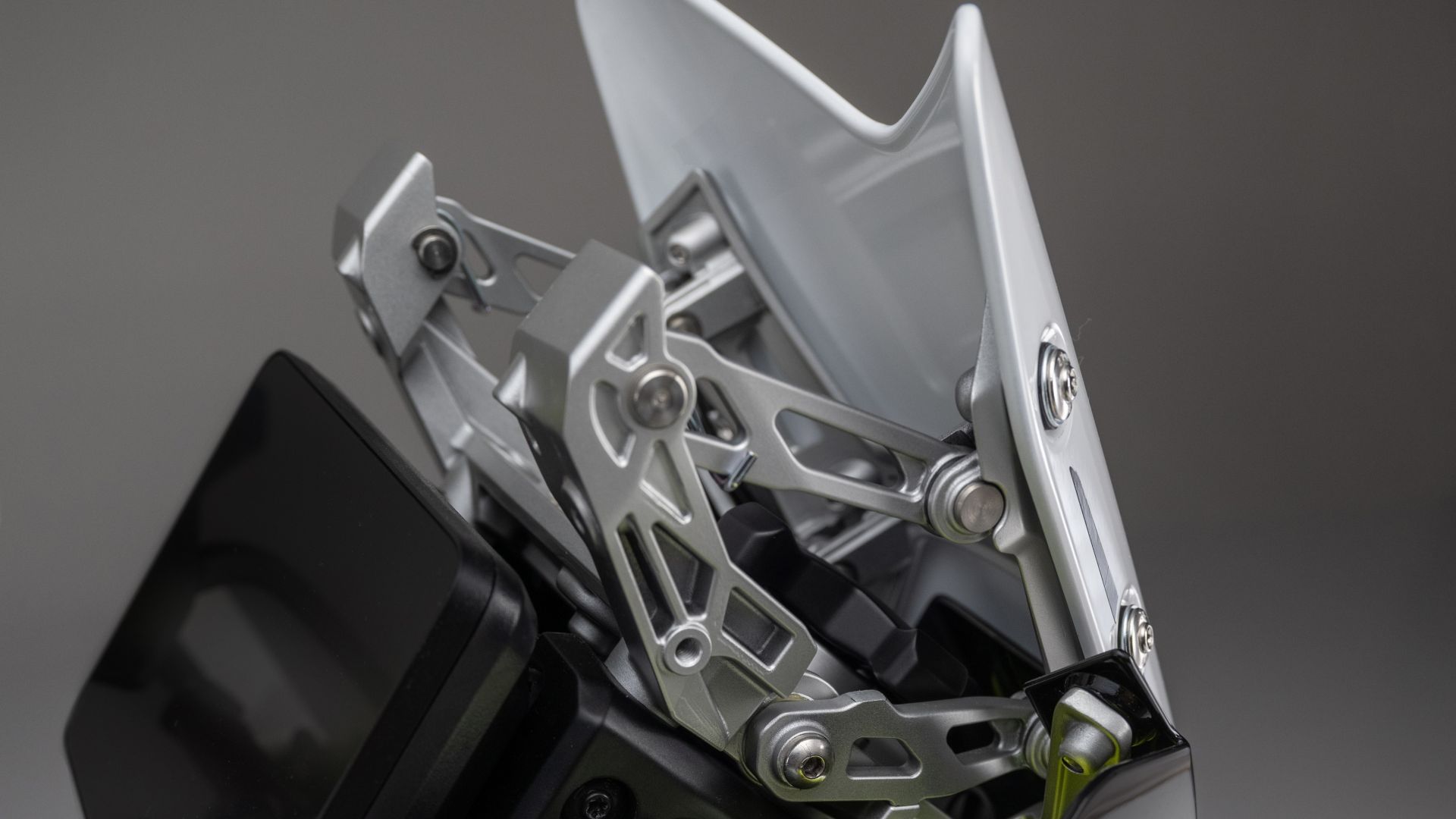 Davanti si fa notare subito il nuovo parabrezza compatto con spoiler fumé, regolabile manualmente o elettricamente (a seconda della versione). La struttura a quadrilatero che lo sostiene dà spettacolo, diventando un vero elemento di design che unisce funzione e presenza scenica.