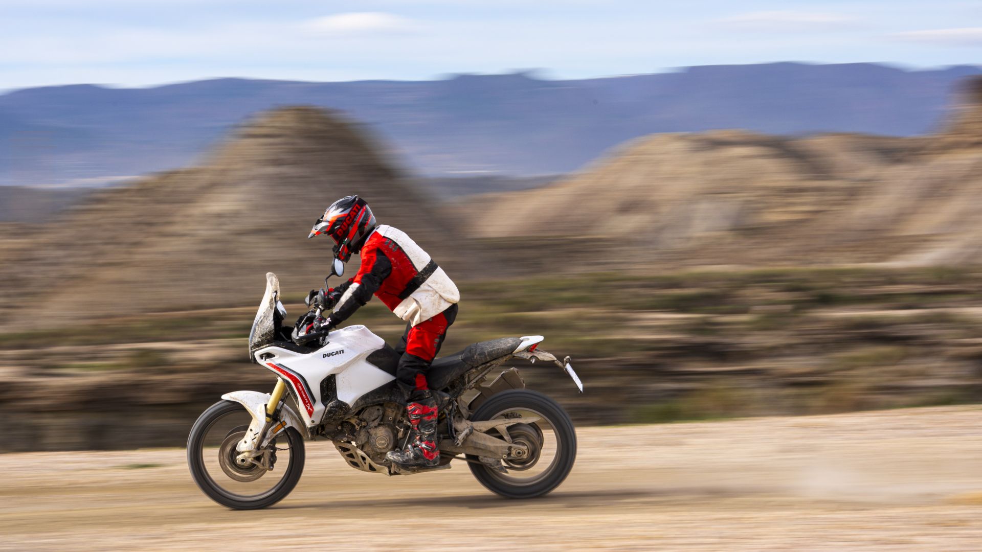 Con il forcellone lavora un pacchetto sospensioni KYB completamente regolabile, una forcella da 46 mm con regolazioni indipendenti per ciascun stelo e un mono – con regolazione remota del precarico – ora dotato di leveraggi progressivi, con escursioni ruota di 230 e 220 mm. L'impianto frenante Brembo, con pinze monoblocco M4.32, morde ora nuovi dischi da 305 mm, è dotato di pastiglie dedicate e pompa assiale con leva di nuovo design, I cerchi a raggi tubeless da 21'' e 18'' montano Pirelli Scorpion Rally STR 90/90 e 150/70. Il peso della nuova Ducati DesertX 2026 è di 209 kg senza carburante (il serbatoio è da 18 litri).