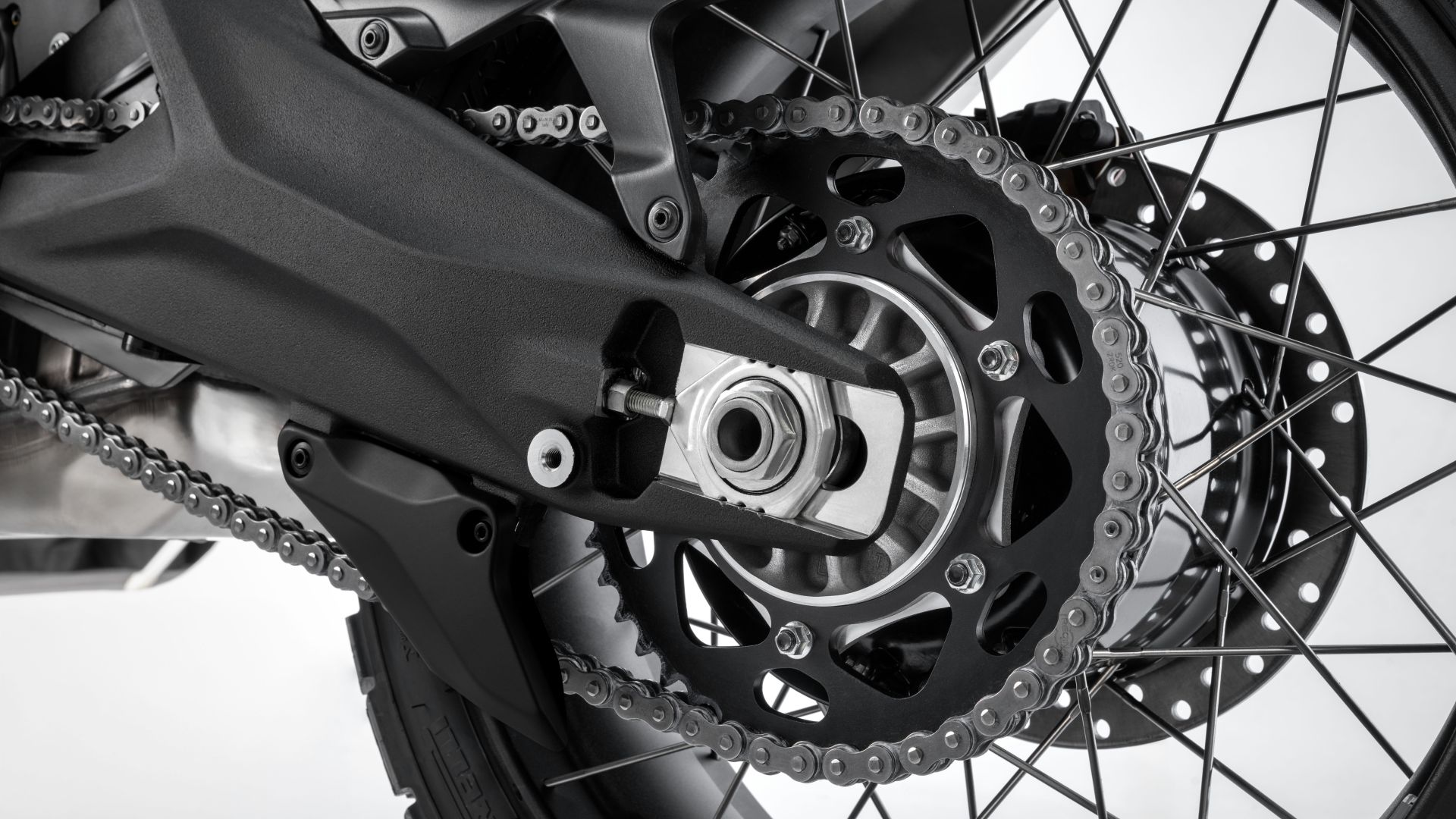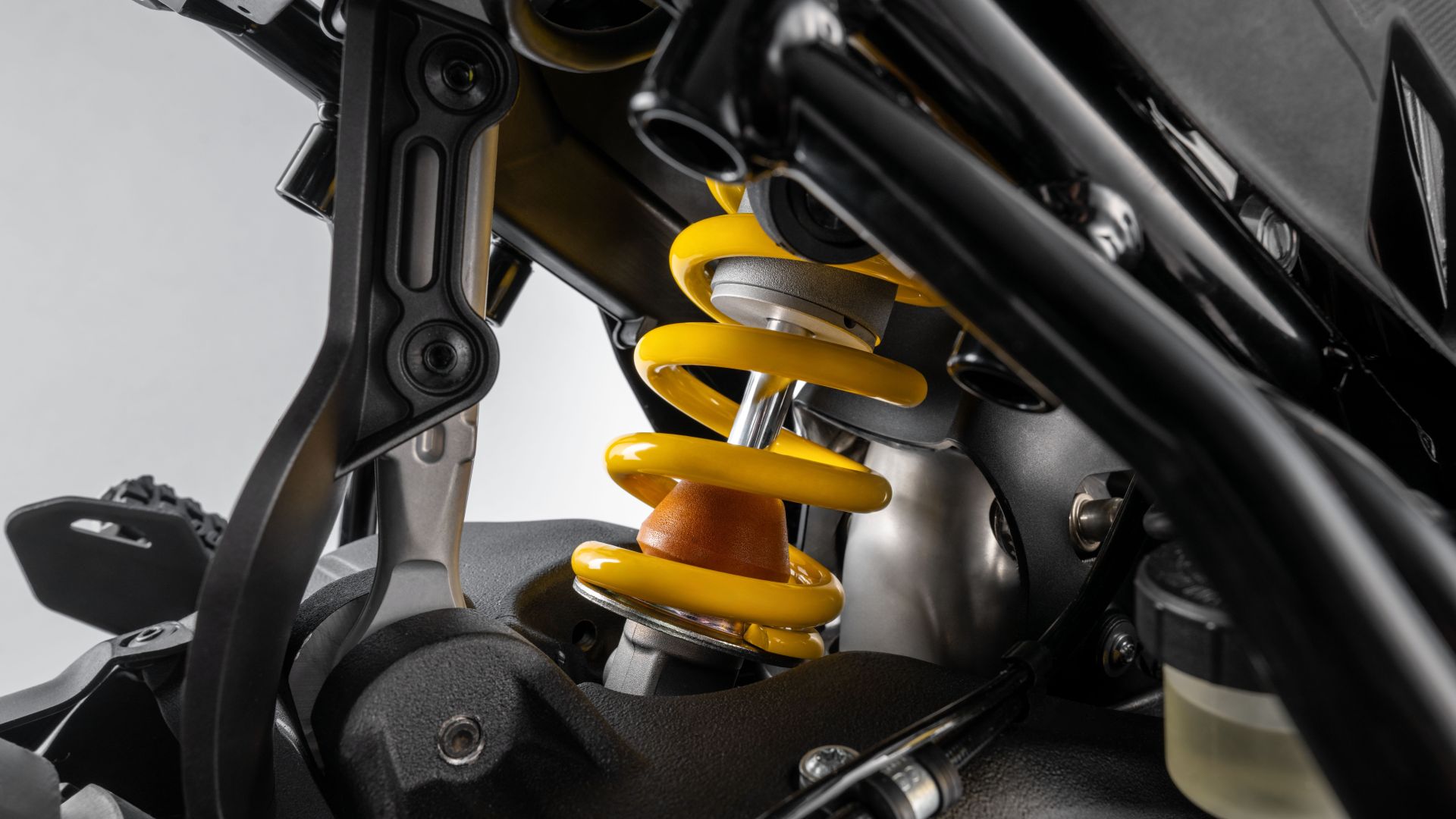 La DesertX 2026 dice addio al telaio a traliccio in tubi d'acciaio per sposare la filosofia del monoscocca che sfrutta il motore come elemento strutturale (e fa anche da airbox). Una soluzione che ha permesso di avere un telaio più leggero e più rigido, con il plus di un filtro aria più facilmente raggiungibile e quindi lavabile, anche dopo l'intenso uso in offroad. Grandi novità anche nella parte posteriore, con un forcellone bibraccio in alluminio dedicato, sviluppato appositamente per DesertX (resta al suo posto il telaietto reggisella a traliccio).