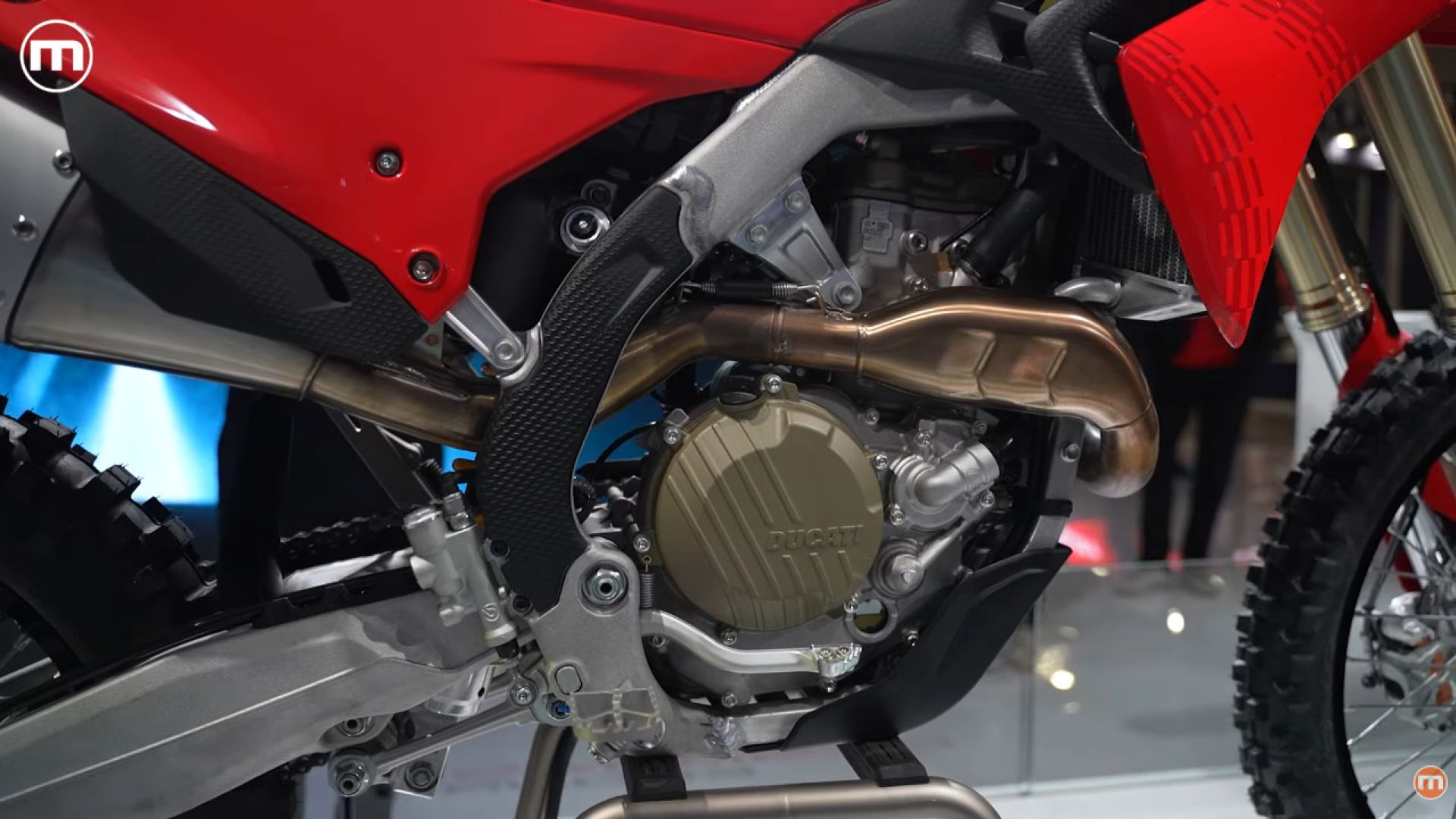 La 450 Enduro deriva dalla 450 MX, dalla quale eredita parecchie soluzioni. Il motore, per esempio, è stretto parente. È un monocilindrico di 450 cc con distribuzione desmodromica e 4 valvole. In configurazione cross eroga quasi 63 CV mentre, ovviamente, sulla Desmo450 Enduro il picco di potenza sarà inferiore (anche per via dell'omologazione), tuttavia si parlerà di una potenza importante. Gli intervalli di manutenzione saranno allineati a quelle delle moto competitor. Il serbatoio è da 8,5 litri e trasparente, per avere a colpo d'occhio l'idea di quanto carburante c'è a bordo. Il cambio è a sei marce.