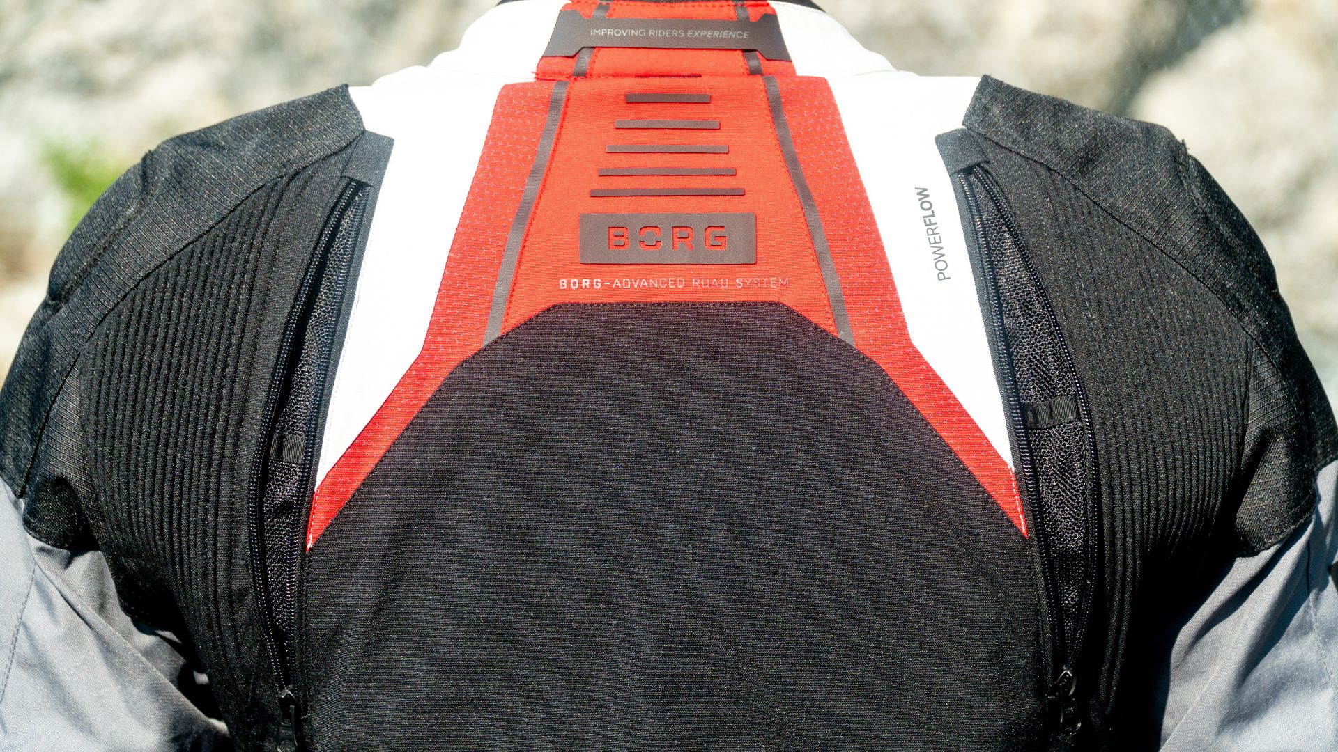 La Borg 2 è caratterizzata da un taglio corto nella parte anteriore, mentre si allunga nella parte posteriore per tenere al coperto la zona lombare. Volendo può essere collegata integralmente (o con cerniera corta più rapida) al pantalone abbinato Borg 2, che ha caratteristiche costruttive paragonabili a quelle della giacca, quindi protezioni AA, strato impermeabile, rinforzi in cordura, zone aerate e regolazioni per la vestibilità. Torando alla giacca, è solo sufficiente il numero di tasche: due esterne più una interna.