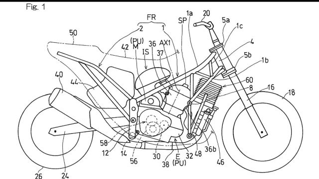 Lo spostamento della batteria dalla zona sotto la sella alla nuova posizione davanti al motore libera spazio che Kawasaki ha scelto di destinare al serbatoio del carburante. Ciò suggerisce che, anche se il brevetto non mostra la carrozzeria, il risultato finale avrà un profilo da scooter. Nei disegni viene citata esplicitamente la presenza di pedane che si estendono lungo i lati del motore, supportate anteriormente dallo stesso supporto del radiatore e prolungate all’indietro fino al telaio sotto il perno del forcellone. Il serbatoio, come mostrato nelle immagini, presenta una sezione posteriore curva che crea un vano sottosella sagomato per accogliere un casco. Pur non offrendo la capacità di carico di un maxi-scooter tradizionale, il modello ibrido risulterebbe comunque pratico.