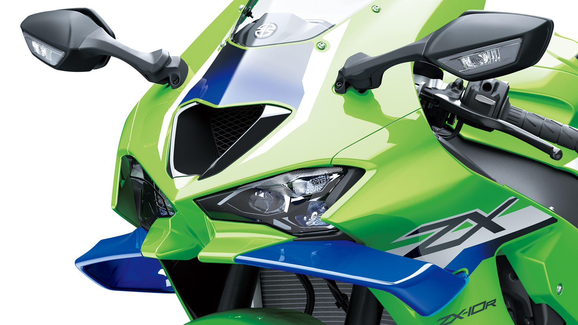 Le nuove Ninja ZX-10R e ZX-10RR 2026 guadagnano un nuovo look e un pacchetto aerodinamico con alette integrate nel frontale. Grazie alle appendici, la deportanza aumenta del 25% rispetto alla versione precedente, per una moto più stabile alle alte velocità e con un avantreno più solido e preciso in inserimento di curva. Il frontale ridisegnato – ora con nuovi fanali dal design compatto, presa d’aria Ram Air riposizionata e winglets – conferisce alla Ninja un look... al passo coi tempi. Il 4 cilindri in linea da 998 cc, ora Euro 5+, è dotato di un secondo sensore O2 per le emissioni. Kawasaki non ha dichiarato i valori di potenza e coppia: il model year 2025 eroga 203 CV – 213 CV con Ram Air – e 114,9 Nm, vedremo se la nuova riuscirà a confermare tali numeri. Sulla RR sono confermati bielle e pistoni Pankl.