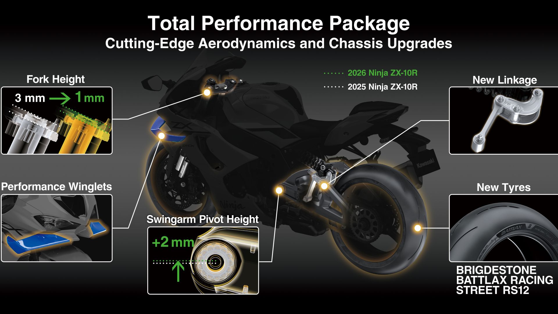 Sulle Ninja ZX-10R e ZX-10RR 2026 resta sostanzialmente invariata la ciclistica, con l'aggiunta dell'ammortizzatore di sterzo Öhlins a doppio tubo (twin-tube), ora di serie su entrambe le versioni della Ninja. Le sospensioni Showa BFF (Balance-Free Front Fork) e BFRC lite (Balance Free Rear Cushion), sviluppate col Kawasaki Racing Team, ricevono tarature orientate all’uso in circuito per ottimizzare il trasferimento di carico e migliorare la maneggevolezza, anche in considerazione del nuovo pacchetto aerodinamico. Confermato anche l'impianto frenante, con pinze Brembo M50 monoblocco, dischi da 330 mm e pompa freno radiale. Sulla Ninja ZX-10RR 2026 sono confermati i tubi freno in treccia metallica.