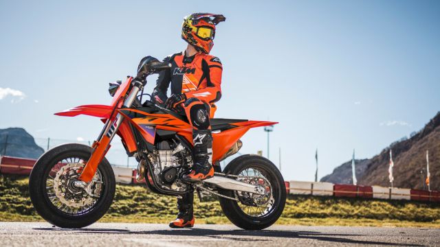 Icona delle supermoto da competizione, la 450 SMR 2026 mantiene le caratteristiche principali della versione precedente. È equipaggiata con il monocilindrico monoalbero SOHC di 450 cc da 63 CV dotato di cambio PANKL a 5 marce e abbinato a una frizione antisaltellamento SUTER. Ha telaio in acciaio idroformato e sospensioni WP XAVT regolabili senza attrezzi, per velocizzare la ricerca del miglior setting. La dotazione include traction control e launch control, freni Brembo con disco anteriore di 310 mm, componenti in alluminio lavorati CNC, cerchi ALPINA di 16,5'' l'anteriore e di 17'' il posteriore, pneumatici slick Metzeler SM K1 Supermoto race-ready e molto altro. Il peso senza benzina è di 109 kg.