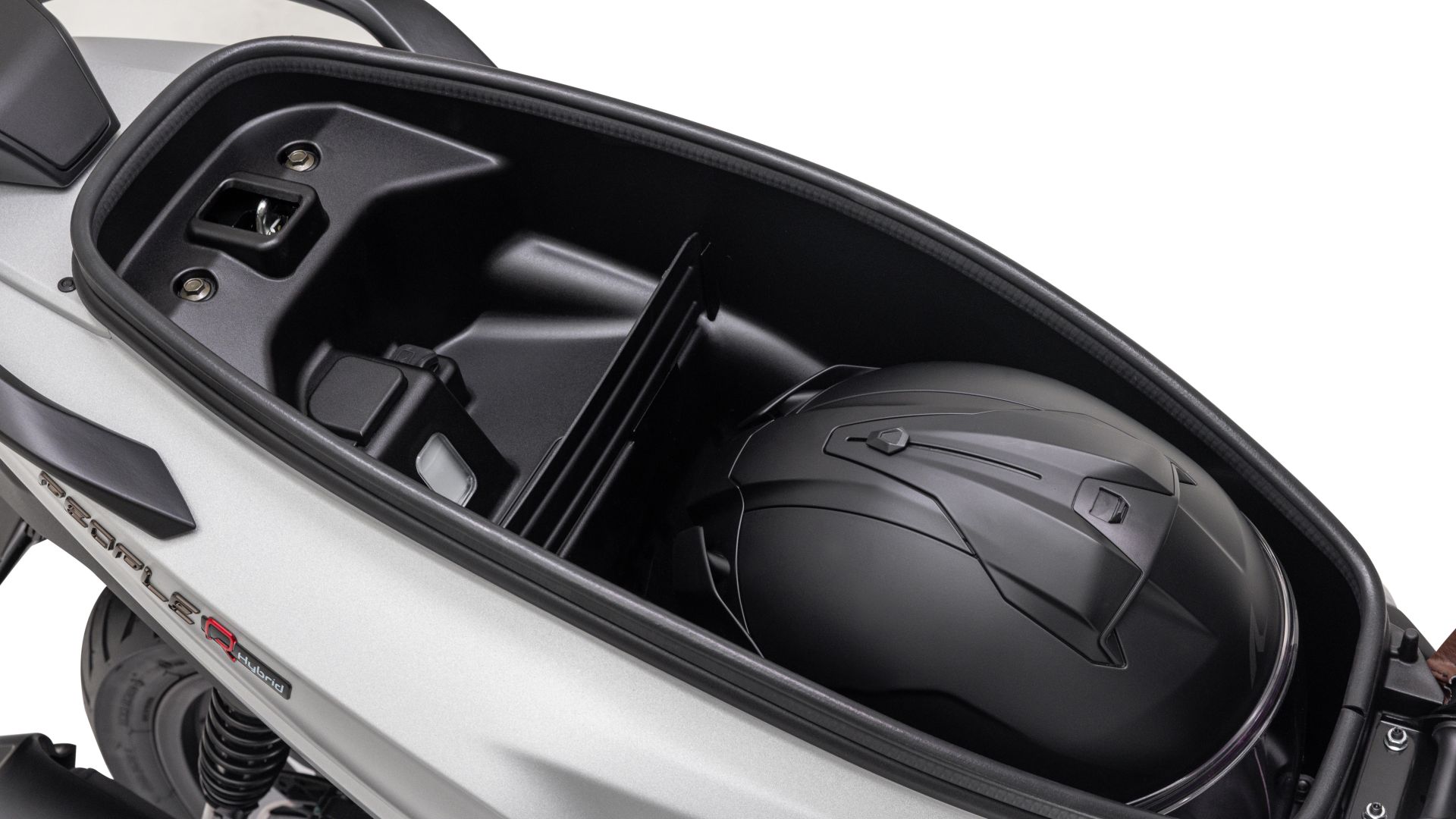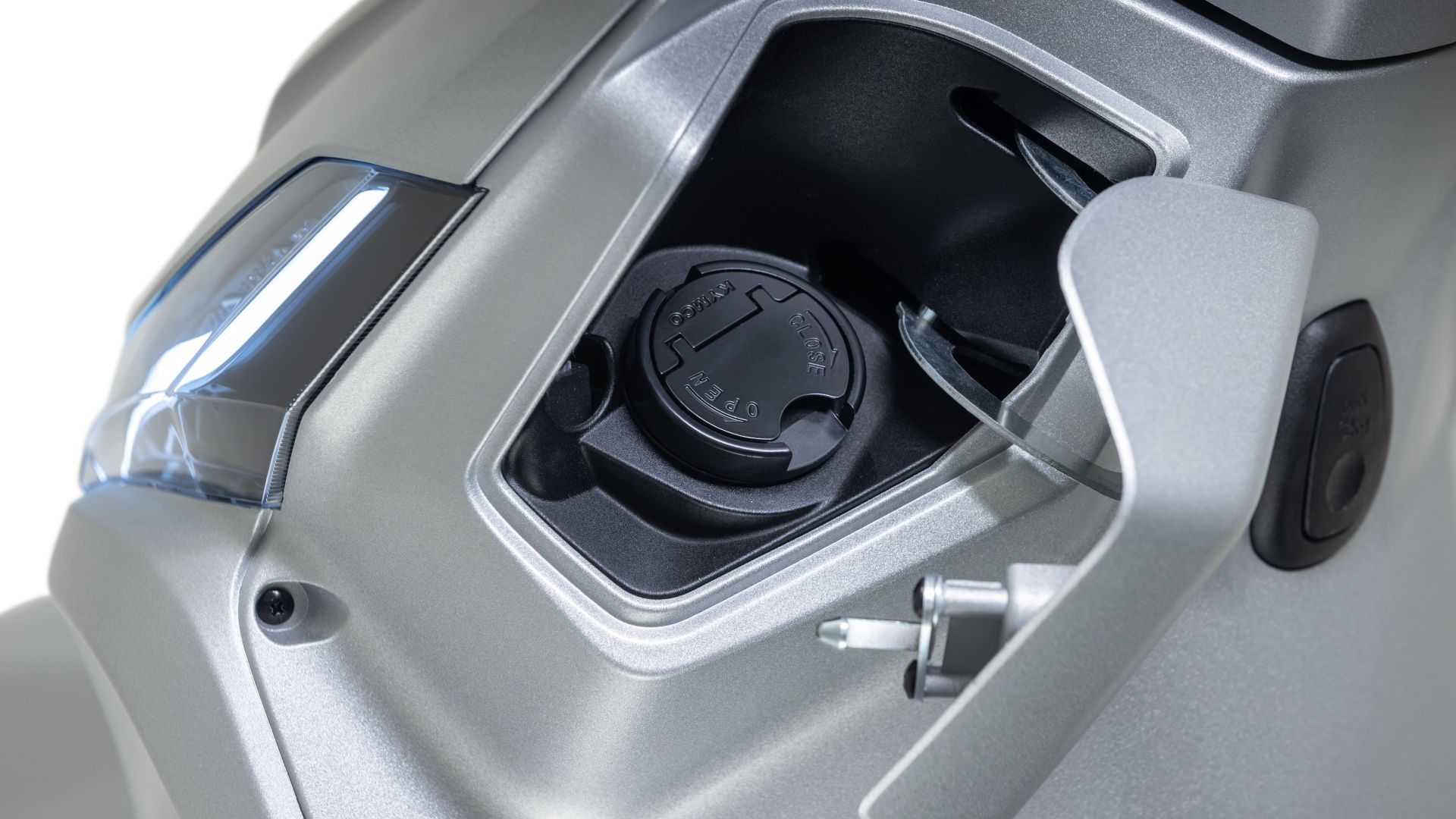 In termini di praticità, lo scooter ibrido di Kymco non delude: il vano sottosella è spazioso, ben organizzato e può contenere un casco integrale grazie al divisorio interno. Presenti anche due prese USB, una Type-C vicino al manubrio e una nel sottosella, utili per ricaricare dispositivi mobili durante la marcia.