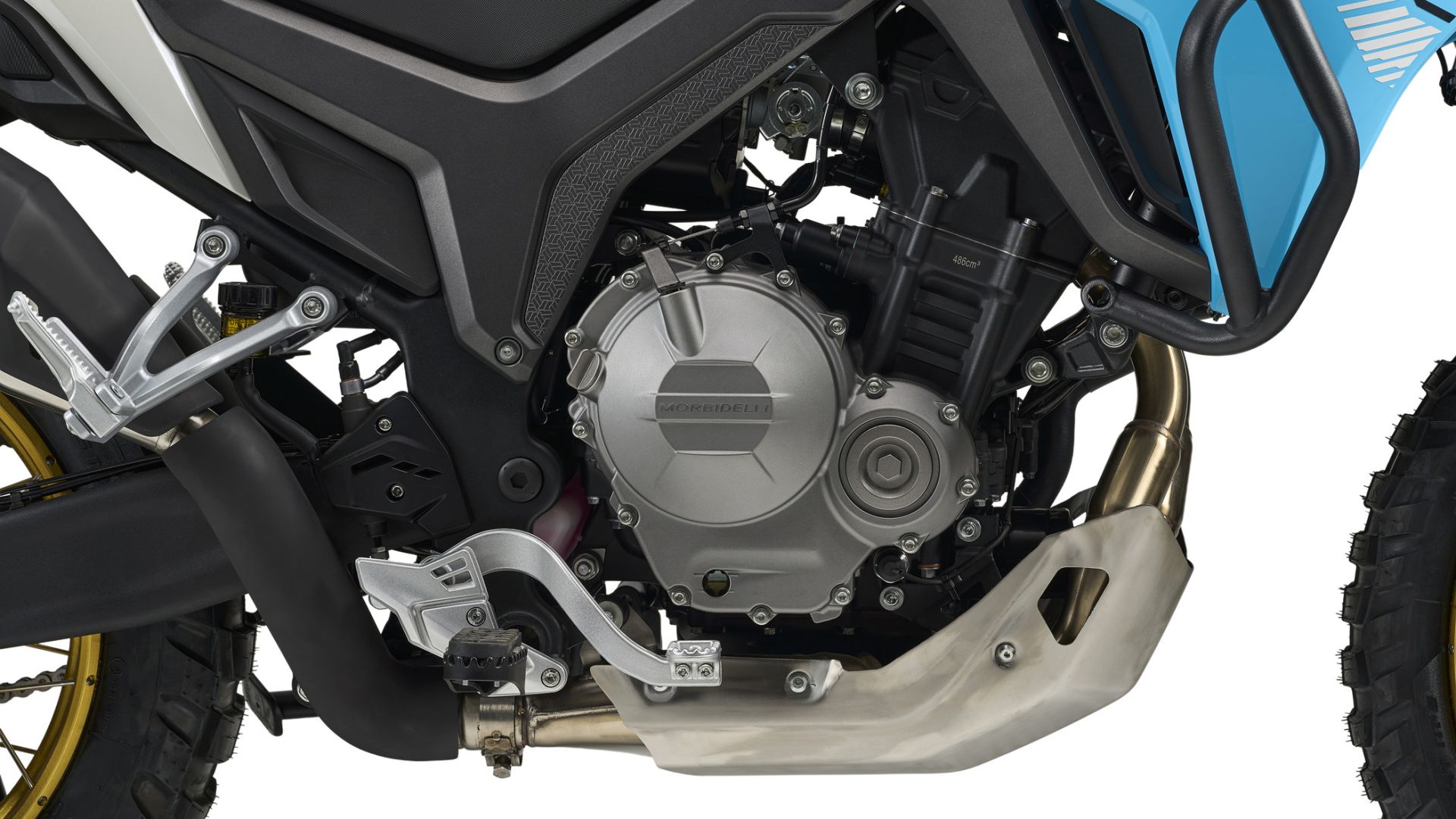 Col suo twin di 486 cc, la T502XR entra a gamba tesa nella combattutissima categoria delle adventure stradali di circa 500 cc con potenza allineata al limite previsto per la guida con patente A2 (35 kW). Dovrà quindi vedersela con le varie Royal Enfield Himalayan, CFMoto 450MT, KTM 390 Adventure R, Kawasaki KLE500, Moto Morini AlltrHike e via dicendo. Si tratta della stessa unità che equipaggia la T502X (48 CV e 45 Nm, doppio albero a camme in testa, perni di manovella sfalsati di 90°, frizione antisaltellamento, cambio a sei marce), dotata però di un nuovo comando del gas ride by wire. Ciò ha dato modo a Morbidelli di definire quattro riding mode (Standard, Rain, Sport, Off-Road). Off-Road prevede un'erogazione adatta a superfici a bassa aderenza e permette una gestione specifica dei sistemi di supporto alla guida.