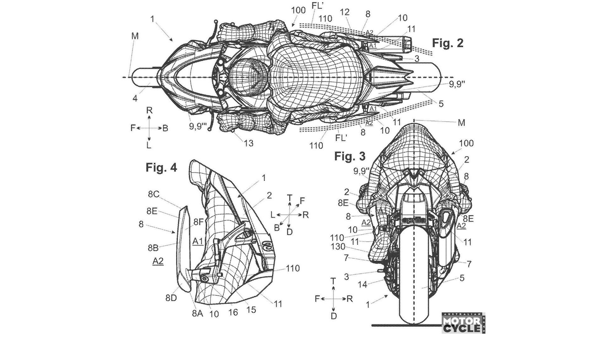 Aprilia “leg wings” - Le innovazioni aerodinamiche introdotte negli ultimi anni sulle MotoGP hanno già dato vita a una generazione di sportive stradali dotate di appendici anteriori. Ora, un nuovo brevetto di Aprilia suggerisce che anche le “leg wings” verticali viste sulle ultime moto da Gran Premio potrebbero arrivare sulla moto di serie.