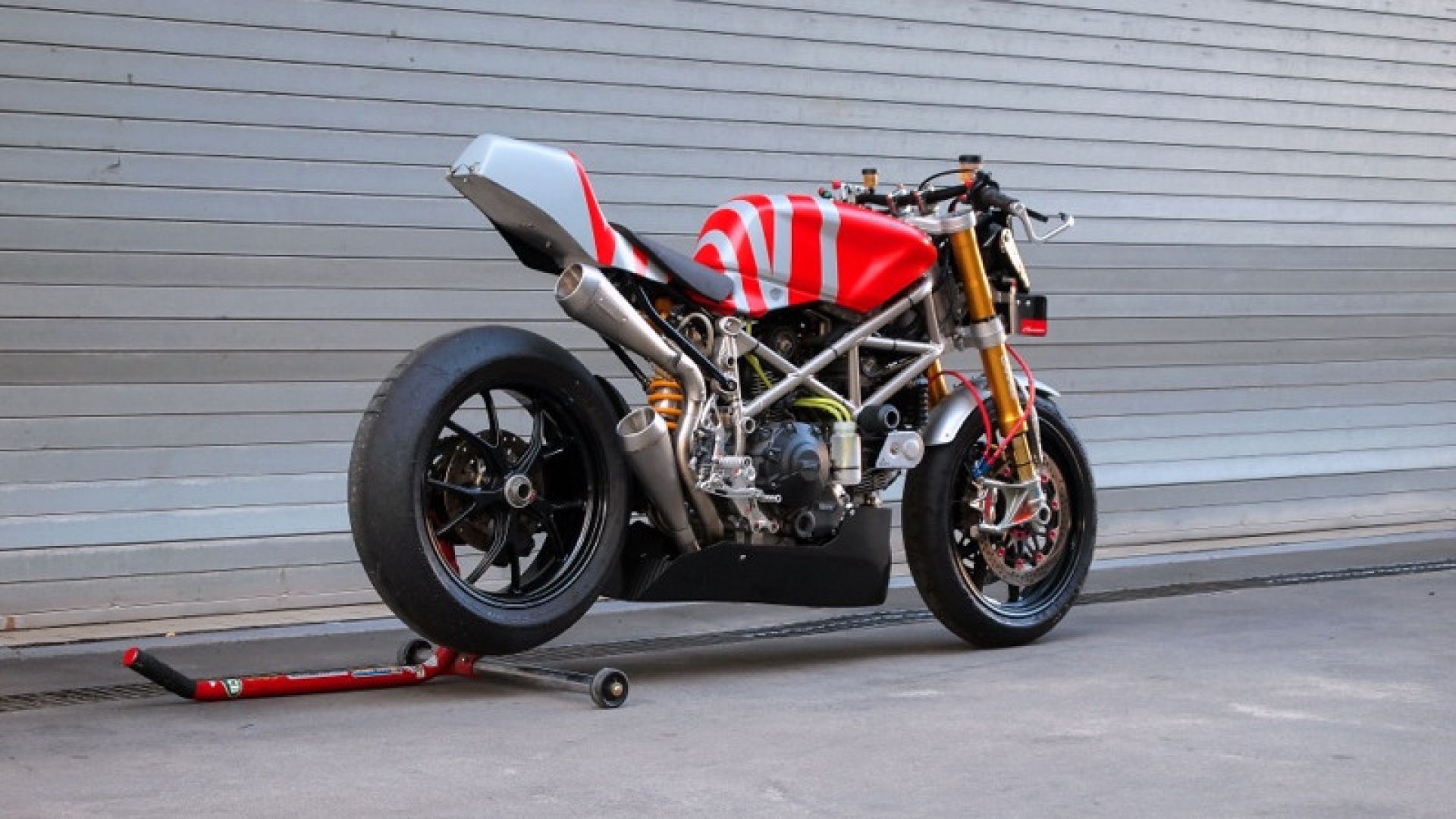 Alla base del progetto intorno a questa Hypermotard c'era la volontà di realizzare una leggera naked da corsa con un bicilindrico raffreddata ad aria. In prima analisi Kim aveva optato per una Monster, ma poi ha virato sulla Hypermotard 796 del 2011 (noi, invece, abbiamo provato la Hypermotard 698). La geometria della moto – non si fatica a crederlo visto il cambiamento – è stata completamente rivista: sono arrivate sospensioni Ohlins, un telaietto ausiliario ad hoc e un nuovo link per il monoammortizzatore. L'impianto frenante è stato aggiornato con pinze Brembo e dischi Sunstar, lo scarico 2-1-2 è stato realizzato in casa e insieme alla modifica dell'airbox è arrivata anche un modulo Rapid Bike Easy. Il serbatoio, infine, è di una Ducati 1098.