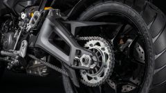 Tutto il pacchetto ciclistico della nuova Ducati Multistrada V2 è stato riprogettato. Abbiamo ora un nuovo telaio monoscocca in alluminio che sfrutta il motore come elemento stressato, e un telaietto posteriore a traliccio in acciaio con il forcellone fuso in alluminio. La versione V2 è dotata di forcella Marzocchi con steli da 45 mm (con escursione di 170 mm) e di ammortizzatore Sachs con link progressivo, entrambi completamente regolabili, mentre la V2 S vanta sospensioni semiattive a controllo elettronico Ducati Skyhook Suspension, con i Suspension Mode selezionabili indipendentemente dai Riding Mode; inoltre, la funzione Minimum Preload permette di abbassare al minimo la sospensione posteriore con la pressione di un tasto. Tutto questo, unito al nuovo motore V2, permette alla Multistrada di raggiungere un peso di 199 kg in ordine di marcia senza carburante (213 kg circa con il pieno) per la versione V2, e 202 kg (216 kg circa con il pieno) per la versione V2 S dotata di sospensioni semiattive. Entrambe le versioni di Multistrada V2, come anticipato in apertura, sono dotate di ruota anteriore da 19”, abbinata a una posteriore da 17”, con pneumatici Pirelli Scorpion Trail II, e un impianto frenante Brembo con doppio disco anteriore da 320 mm e disco singolo da 265 mm al posteriore.