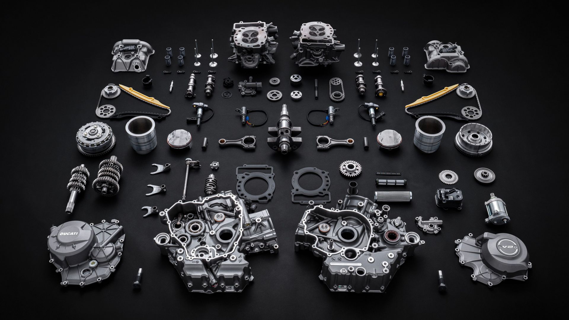 L’accensione è affidata a una candela per cilindro; il rapporto di compressione è di 13,1:1; le canne in alluminio sono riportate e inserite nel basamento sicché le due teste siano fissate direttamente a esso. Lo spazio nella V formata dai cilindri è stato sfruttato posizionando la pompa dell’acqua sulla testa del cilindro anteriore e uno scambiatore di calore acqua-olio. Il basamento è a carter semi secco con pompe di recupero, la frizione in bagno d’olio è antisaltellamento, il cambio è a sei marce, elettronico bidirezionale. A detta della Casa, nel range 4.000-11.000 è sempre disponibile un valore di coppia uguale o superiore all’80% del massimo. Il limitatore interviene a 11.000 giri/min nelle prime quattro marce e a 11.350 giri/min nelle ultime due. Riguardo la manutenzione, i tagliandi sono fissati ogni anno o 15.000 km con controllo e registrazione del gioco valvole ogni 30.000 km.