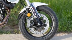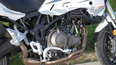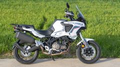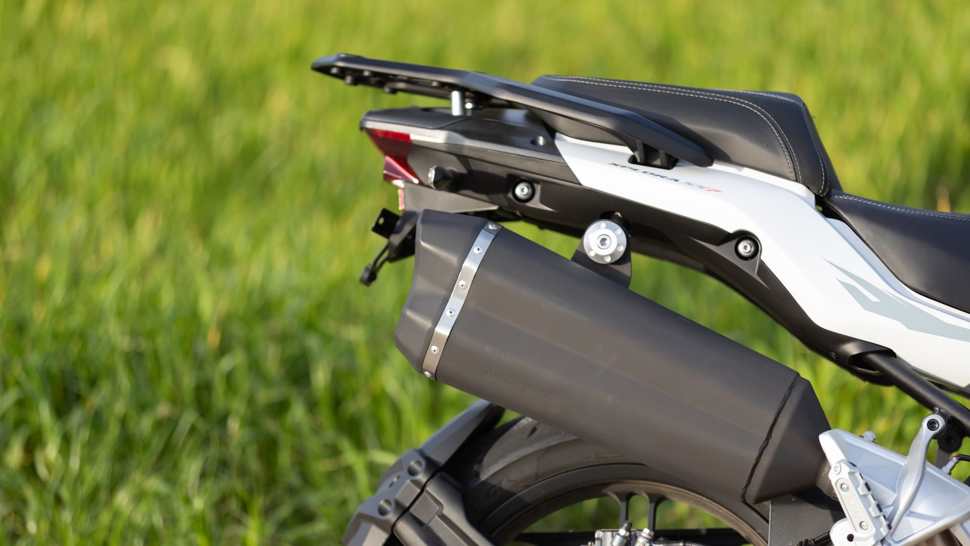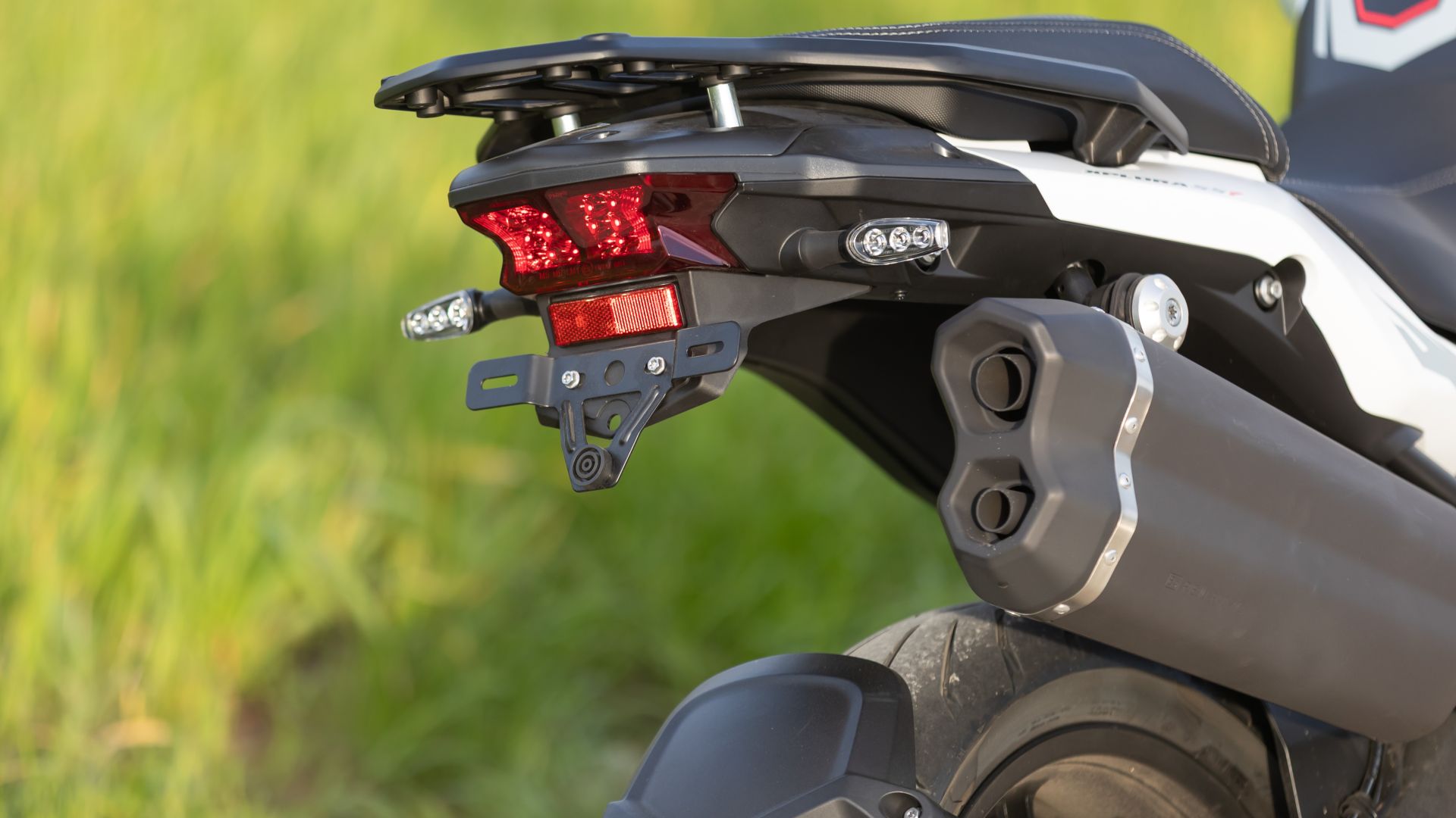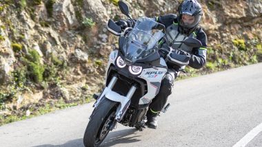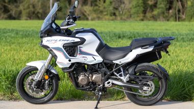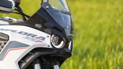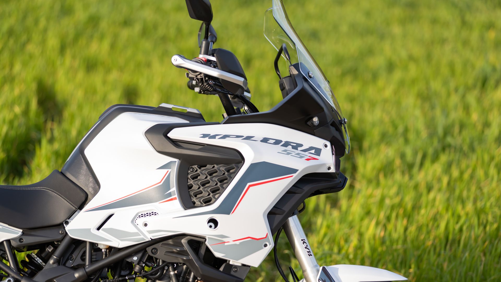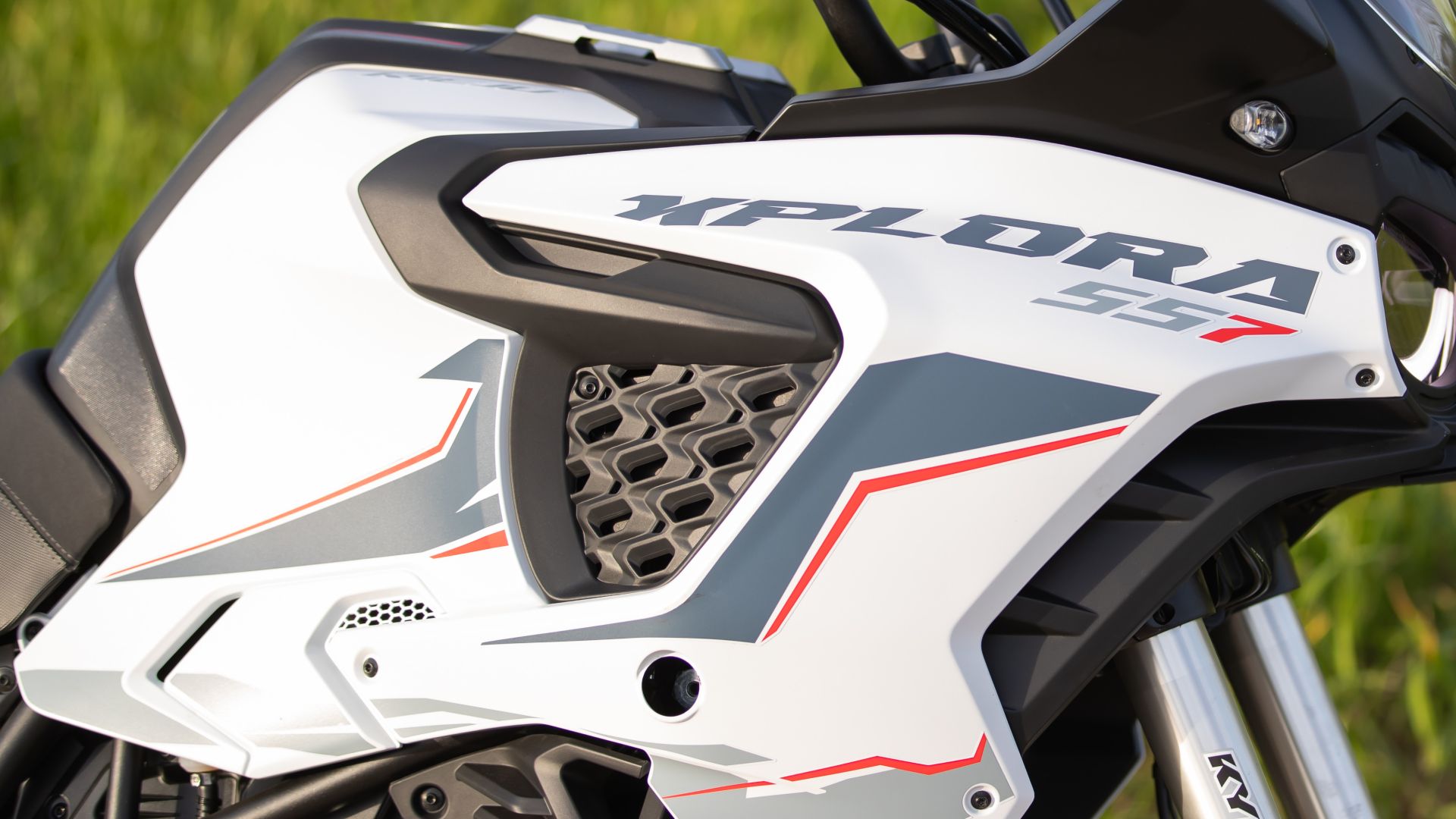 Xplora 557 è fornita di serie di leve regolabili, cavalletto laterale, protezione del radiatore, paramani, portapacchi posteriore e, come optional ci sono barre di protezione e kit di borse laterali.