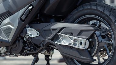 SCOOTER-MOTO Ma il motore è solo l'antipasto per la ciclistica dall'attitudine motociclistica di ADXTG 400: telaio e forcellone sono infatti derivati da quelli del maxi scooter Maxsym TL 508 – qui la mia prova – un tubolare in acciaio con piastre in alluminio il primo e un bibraccio interamente in alluminio – stesso peso ma del 20% più lungo – con sospensione multilink il secondo, per non parlare della trasmissione finale a catena. Completano il quadro la forcella a steli rovesciati da 41 mm e la sospensione posteriore con, rispettivamente, 140 e 115 mm di escursione (160 mm l'altezza da terra). Le ruote, da 15'' e 14'' con pneumatici 120/70 e 150/70, ospitano una coppia di dischi, davanti da 275 mm con pinza radiale a 4 pistoncini, dietro da 233 mm con pinza a 2 pistoncini. A completare i dati della scheda tecnica di SYM ADXTG 400 ci pensano il peso di 213 kg a secco, il serbatoio da 13 litri di capienza e l'interasse da 1.535 mm.