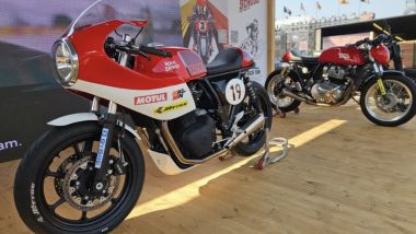 La grande novità di Continental GT 750 – qui in versione corsaiola GT-R – è il bicilindrico parallelo da 750 cc. Il nuovo motore – presente anche sul concept di Himalayan 750 – monta un sistema di raffreddamento aria/olio rivisto, per meglio rispondere alle esigenze dell'unità con maggiore cubatura: i valori di potenza e coppia non farebbero gridare al miracolo, con circa 55 CV e 60 Nm – ma si tratta solo di stime – in luogo degli attuali 48 CV e 52 Nm del motore da 648 cc. La ciclistica non sembra cambiare molto, tra telaio tubolare in acciaio, forcella a steli tradizionali e coppia di ammortizzatori regolabili nel precarico, ma arriva una coppia di dischi con pinze ByBre al posto del disco singolo dell'attuale Continental GT 650. Ovviamente la GT-R che vediamo nelle foto monta anche cupolino, pancia della carena e codino monoposto, trattandosi della versione da corsa, mentre la GT 750 è attesa in versione ''nuda'', come da tradizione (ma non è esclusa una versione GT-R stradale). Dopo le foto spia di qualche mese fa, la Continental GT 750 sembra sempre più vicina... Vi terremo aggiornati.