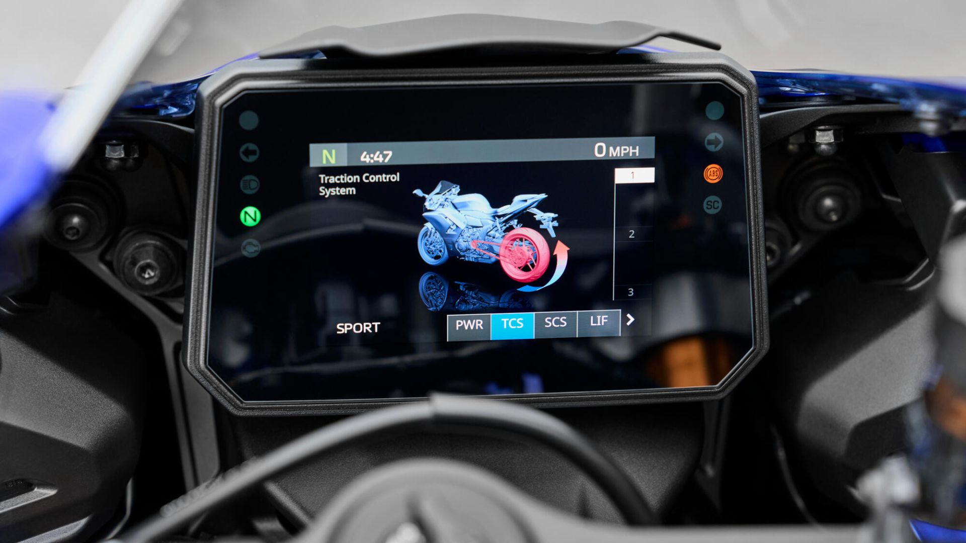 La strumentazione della R7 2026 comprende un display TFT a colori da 5 pollici con quattro temi selezionabili e una modalità “Track” che evidenzia solo i dati essenziali per la pista, come il cronometro.
