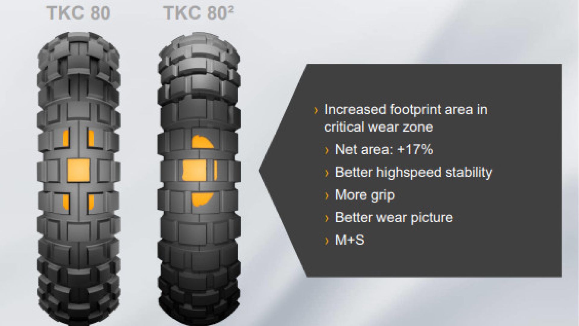 Il battistrada è stato rivisto da zero. Il primo dato significativo riguarda l’area di impronta al suolo, che rispetto a quella delle TKC 80 aumenta del 17%. Duplice l'effetto: migliorano la stabilità e l’usura, ora più omogenea. Resta (ovviamente) l'omologazione M+S.