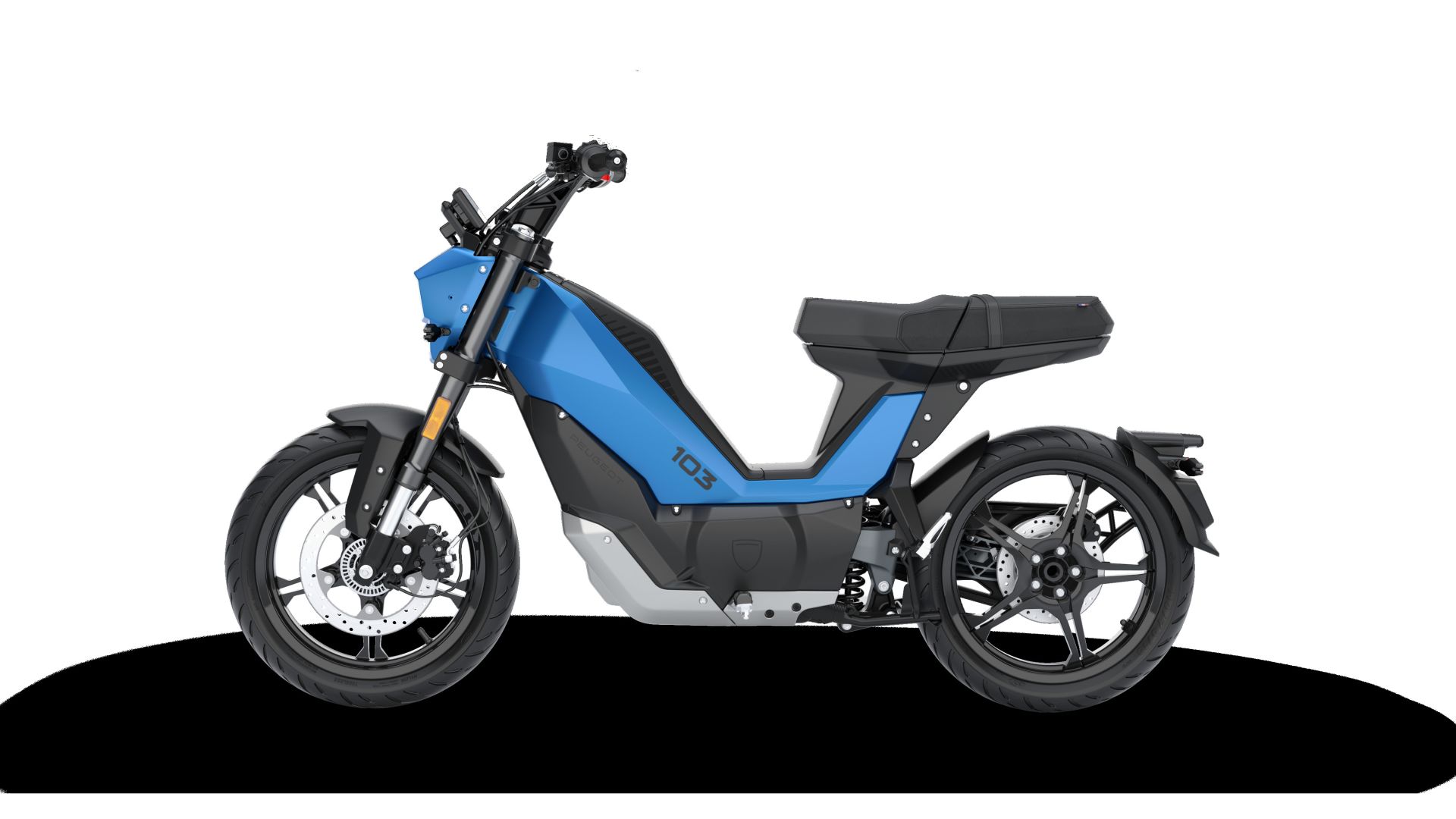 A spostare i due scooter ci pensa il motore elettrico integrato nella parte inferiore del telaio tubolare in alluminio, al quale sono abbinati uno scenografico forcellone monobraccio e la forcella a steli rovesciati da 37 mm. La trazione alla ruota posteriore è portata attraverso una cinghia, lasciata alla vista. Le batterie differenziano i due modelli di Peugeot 103: per entrambi è estraibile, 1.6 kWh per l’equivalente del 50-cc e 2.2 kWh per l’equivalente del 125 cc con conseguente autonomia di 45 km per il piccolo di famiglia e 65 km per il maggiore.