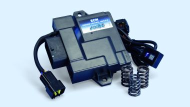 Costa 265 euro + IVA e si tratta di un componente plug & play: è sufficiente scollegare quella originale e collegarla. In sostanza, è la base per le elaborazioni. L'ECM gestisce il motore attraverso la lettura dei sensori e la gestione di attuatori, iniezione carburante, accensione, componenti ausiliari. Dotata di un microprocessore di ultima generazione, abbinata a componenti progettati specificamente per il monocilindrico 4T 3 valvole Piaggio permette un netto miglioramento delle prestazioni - non godibile su strade aperte al traffico. Viene venduta in kit insieme alle molle di richiamo delle valvole e prevede tre mappature già configurate, impostabili attraverso un selettore.