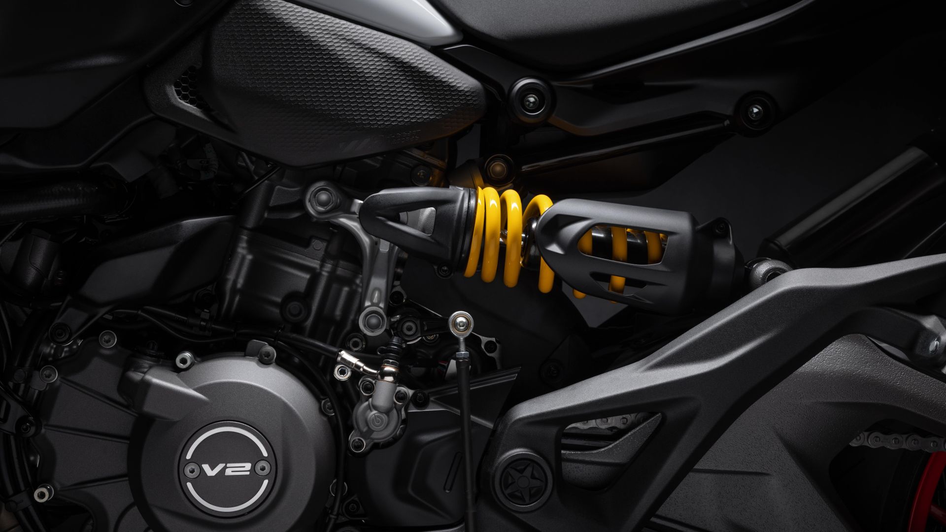 Il nuovo Monster non si guarda alle spalle neanche in tema di ciclistica, la base resta la struttura monoscocca in alluminio, che svolge il doppio ruolo di telaio e airbox, con il motore V2 impiegato come elemento portante, architettura introdotta per la prima volta nel 2021. Una scelta che ha segnato il distacco definitivo dal tradizionale traliccio in acciaio dei Monster storici, portando vantaggi concreti in termini di compattezza e contenimento dei pesi.