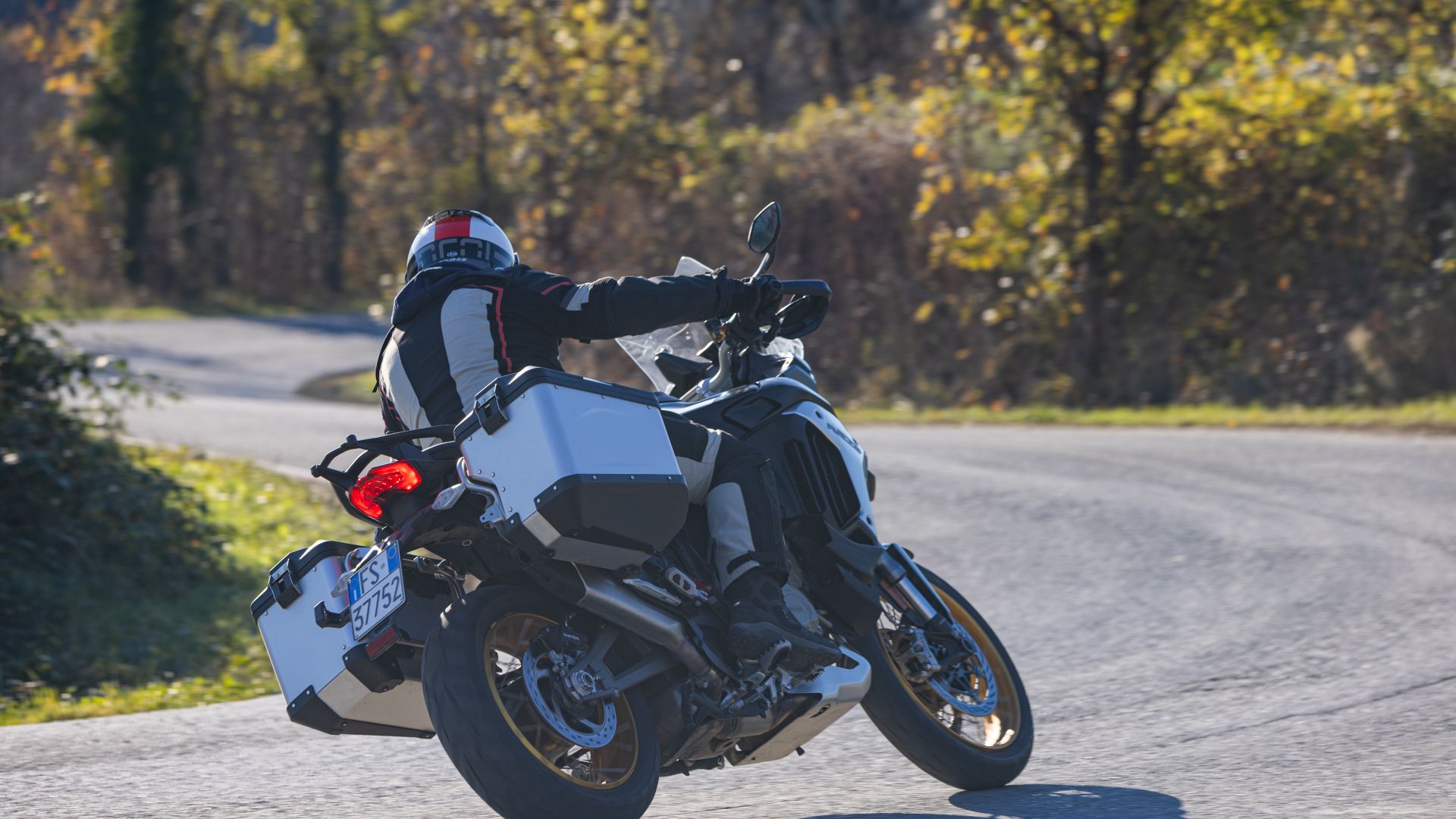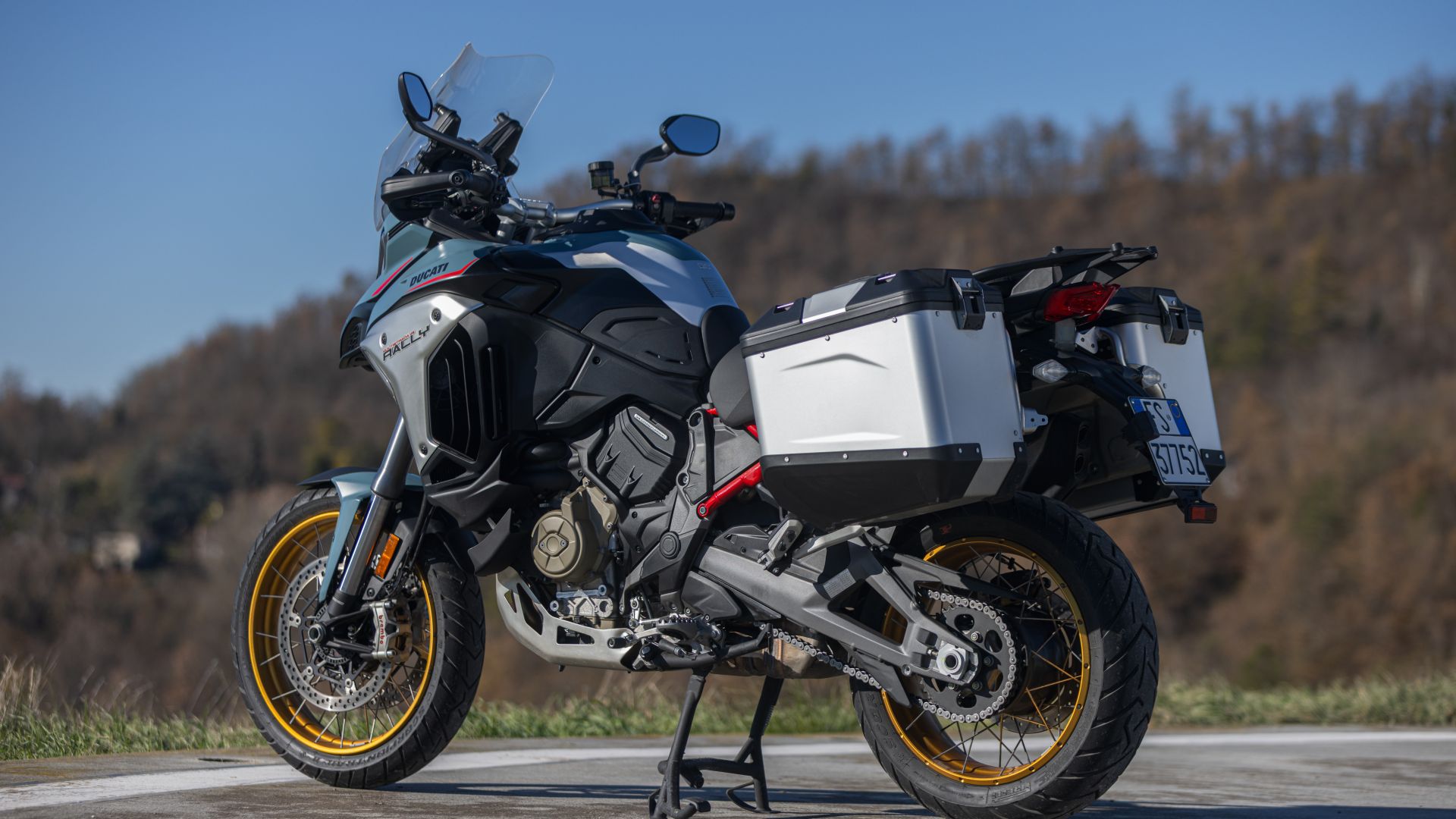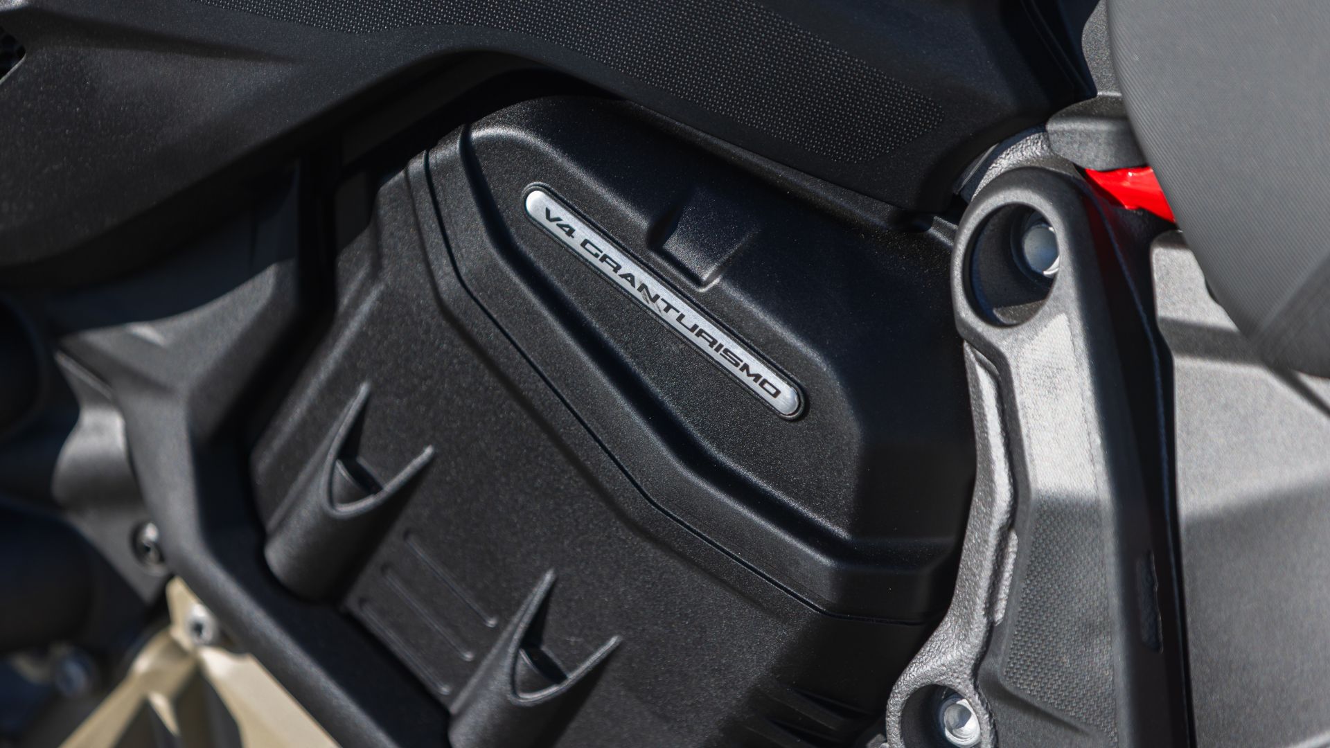 Il motore resta il noto V4 Granturismo da 1.158 cc: 170 CV, 121 Nm e la deattivazione estesa della bancata posteriore, attiva anche a bassi regimi (tranne in prima). La manutenzione rimane uno dei suoi punti forti: olio ogni 15.000 km e gioco valvole a 60.000 km. Arriva anche il nuovo quickshifter derivato dalla Panigale V4, ora più preciso grazie al sensore sul tamburo del cambio. Telaio monoscocca in alluminio, ruote 19/17 e pneumatici Pirelli Scorpion Trail II completano la ciclistica.