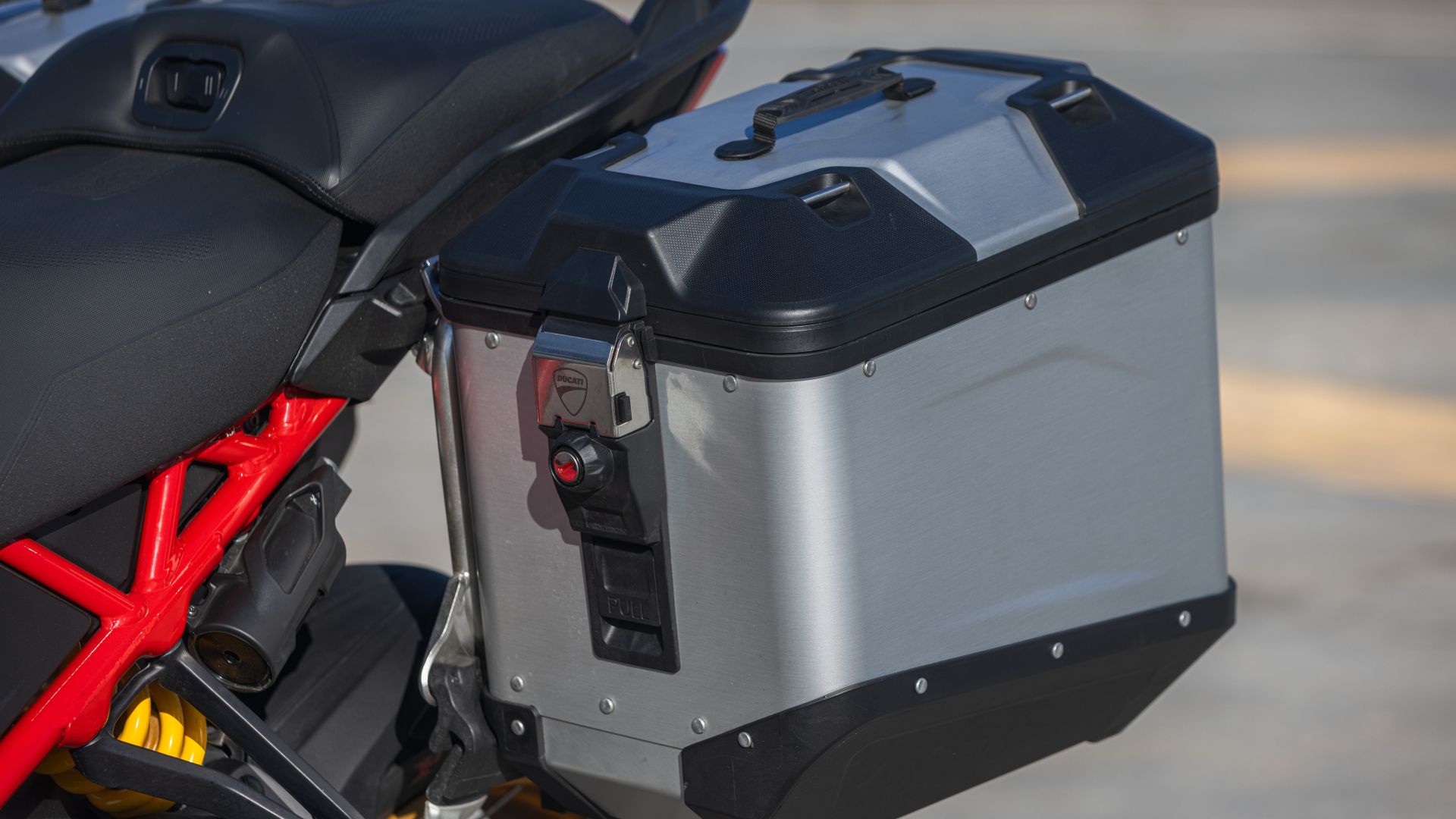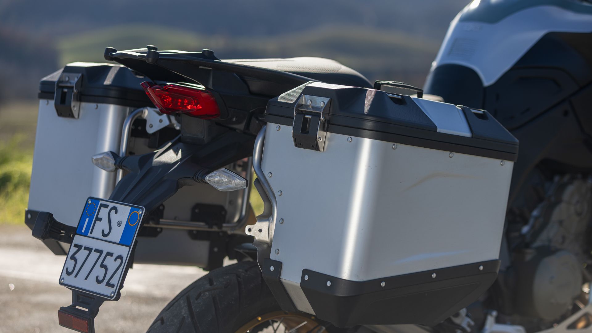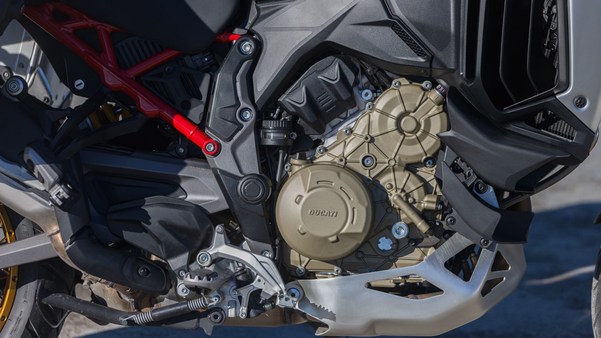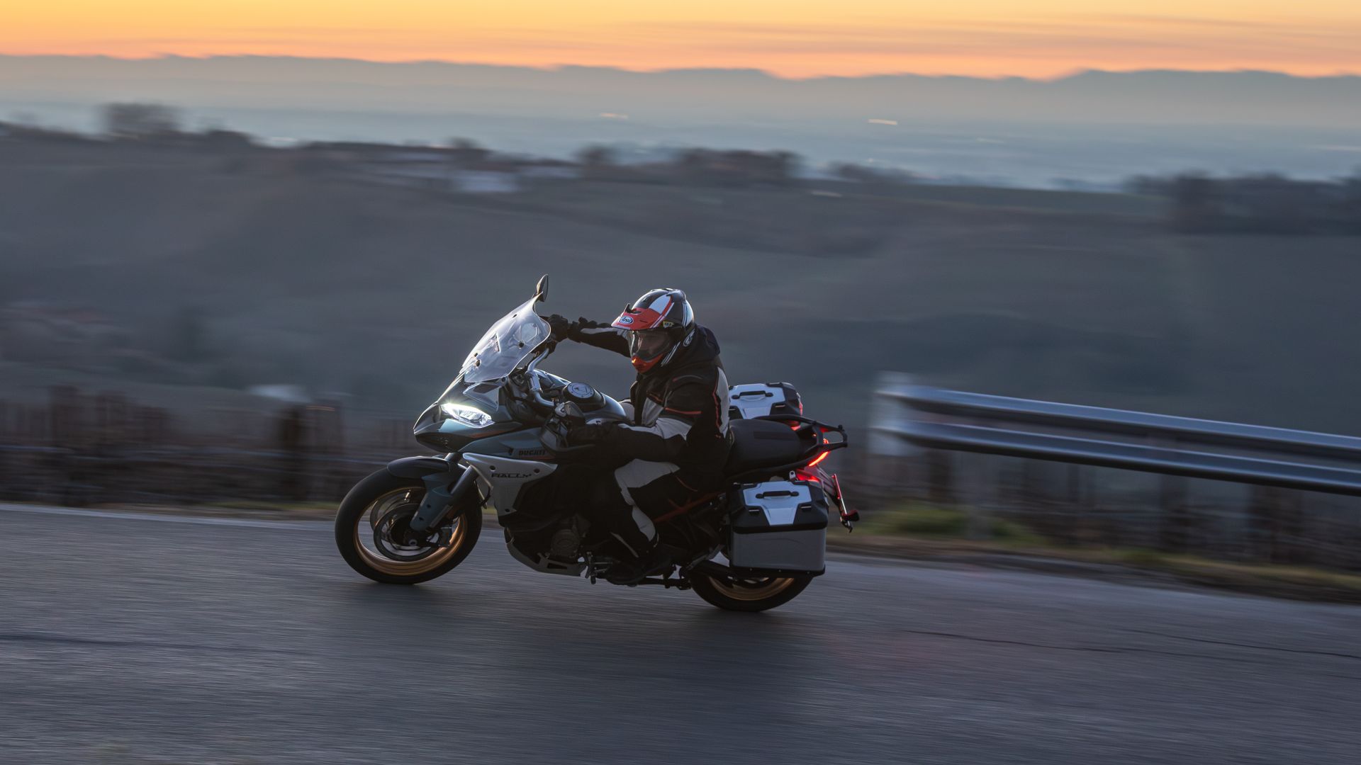 Il motore resta il noto V4 Granturismo da 1.158 cc: 170 CV, 121 Nm e la deattivazione estesa della bancata posteriore, attiva anche a bassi regimi (tranne in prima). La manutenzione rimane uno dei suoi punti forti: olio ogni 15.000 km e gioco valvole a 60.000 km. Arriva anche il nuovo quickshifter derivato dalla Panigale V4, ora più preciso grazie al sensore sul tamburo del cambio. Telaio monoscocca in alluminio, ruote 19/17 e pneumatici Pirelli Scorpion Trail II completano la ciclistica.