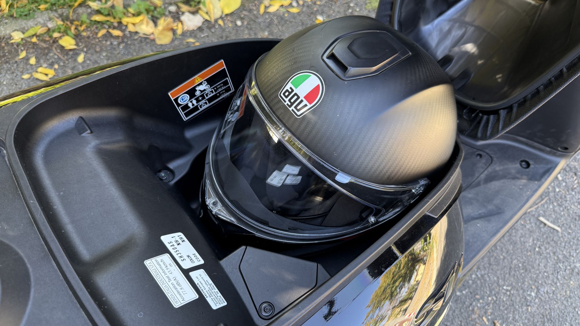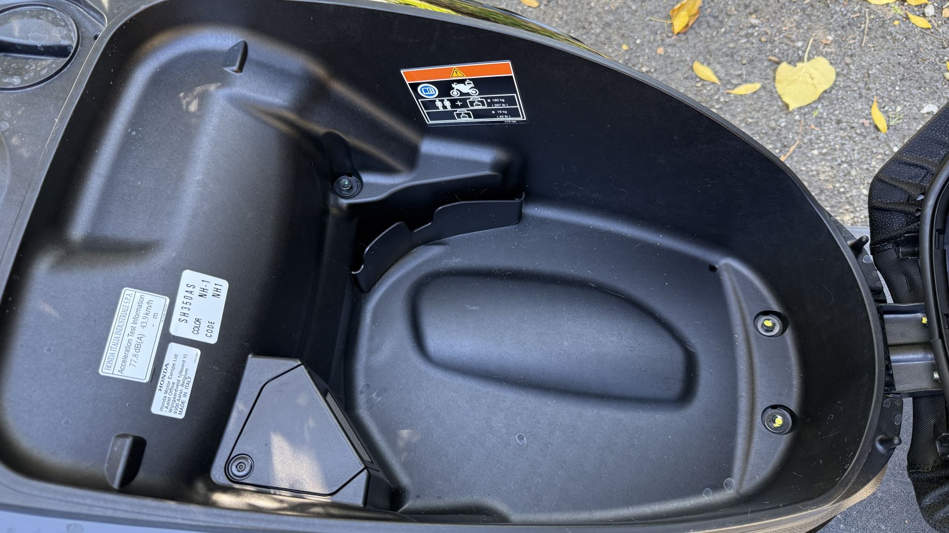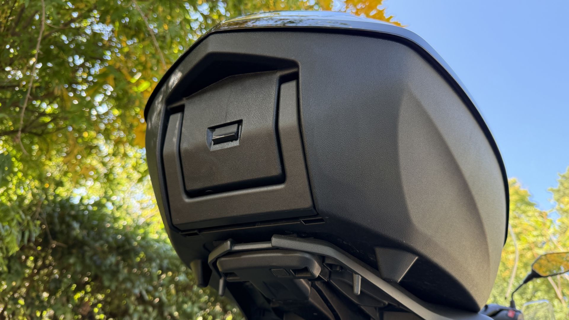 Ma SH350i 2025 non offre solo un bel parabrezza di serie, bensì anche lo Smart Top Box, per gli amici ''bauletto''. La nomenclatura fighetta, ve lo garantisco, se l'è guadagnata tutta: per aprirlo basta avere le chiavi in tasca, c'è solo da intercettare il pulsante sulla piastra inferiore – vedi foto sopra – operazione che sulle prime vi renderà contorsionisti un po' goffi nel tentativo di trovare il tastino. Grazie a un'ampia capacità di carico nel baule entra uno zaino con pc ed avanza spazio. SH350i aggiunge alla dotazione di serie anche il cavalletto laterale, comodo quando non si vuole coricare sul centrale, mentre col sistema Smart Key la chiave continua a rimanere in tasca, anche per accenderlo. Il sottosella non ha difficoltà ad ospitare un casco integrale.