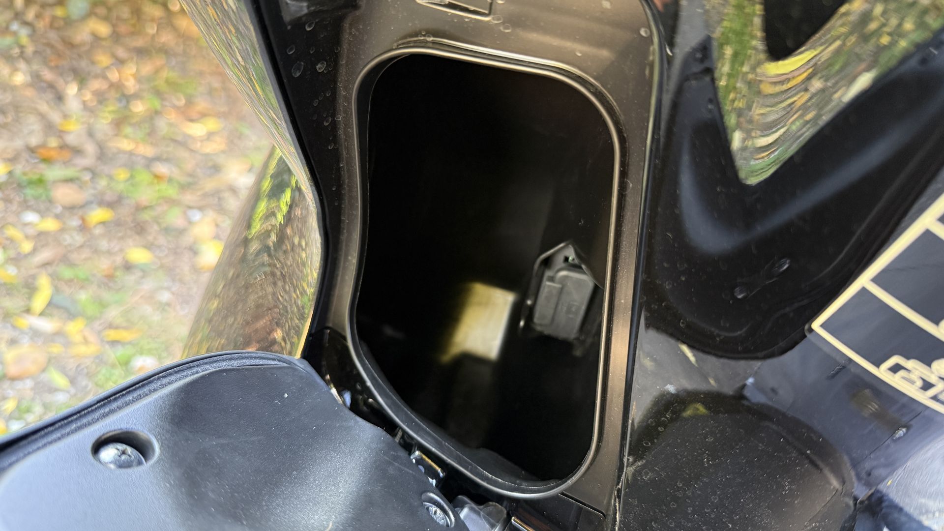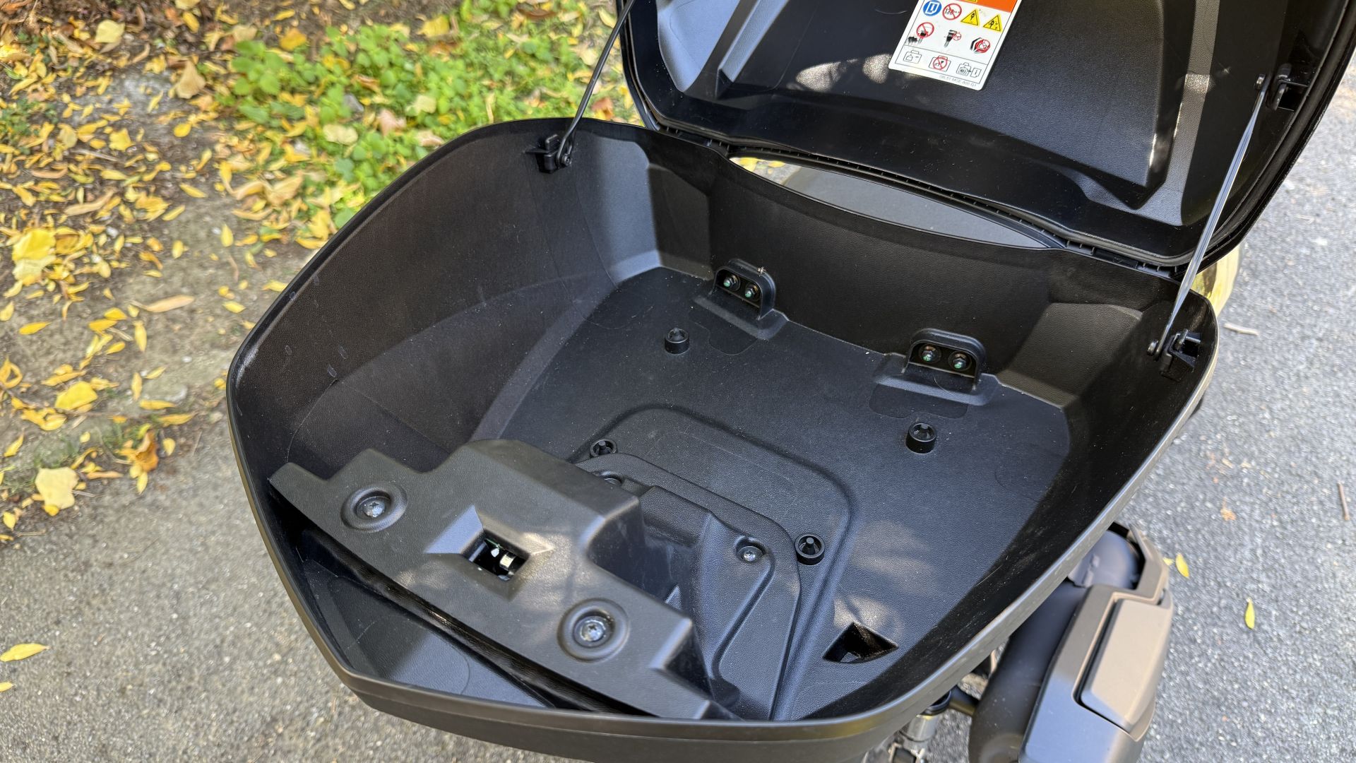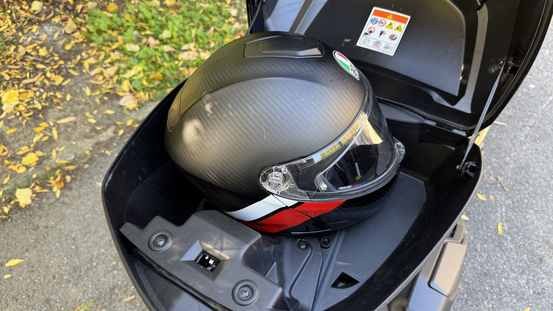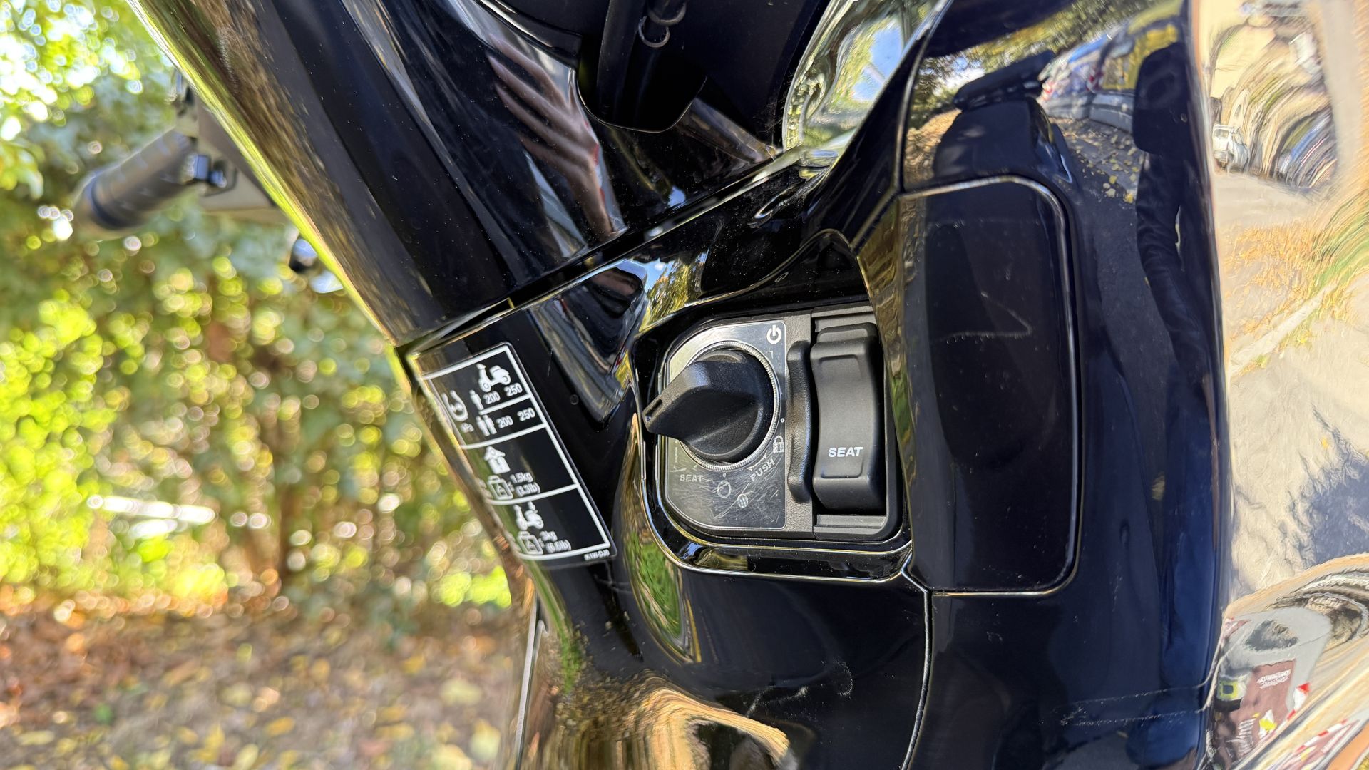 Ma SH350i 2025 non offre solo un bel parabrezza di serie, bensì anche lo Smart Top Box, per gli amici ''bauletto''. La nomenclatura fighetta, ve lo garantisco, se l'è guadagnata tutta: per aprirlo basta avere le chiavi in tasca, c'è solo da intercettare il pulsante sulla piastra inferiore – vedi foto sopra – operazione che sulle prime vi renderà contorsionisti un po' goffi nel tentativo di trovare il tastino. Grazie a un'ampia capacità di carico nel baule entra uno zaino con pc ed avanza spazio. SH350i aggiunge alla dotazione di serie anche il cavalletto laterale, comodo quando non si vuole coricare sul centrale, mentre col sistema Smart Key la chiave continua a rimanere in tasca, anche per accenderlo. Il sottosella non ha difficoltà ad ospitare un casco integrale.
