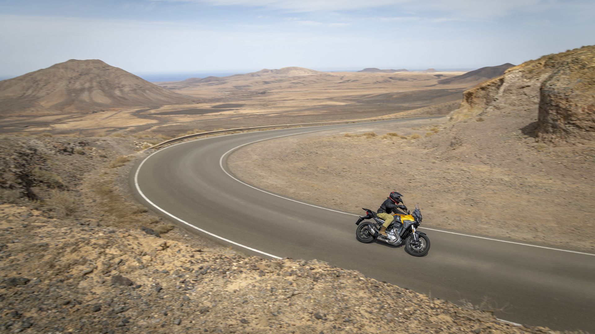 SQUADRA CHE VINCE SI CONFERMA L’ultima arrivata di casa Guzzi condivide il motore Compact Block con la cugina Sport Touring V100 Mandello: il bicilindrico a V di 90° da 1.042 cc, apprezzatissimo sia nella prova su strada, sia nellacomparativa di segmento, non è stato stravolto e conferma le sue prestazioni, con 115 CV a 8.700 giri/min di potenza massima e 105 Nm di coppia a 6.750 giri, anche se qui i kg da spostare sono una decina abbondante in più dato che la Stelvio fa segnare 246 kg in ordine di marcia su piatto della bilancia. Il vantaggio di arrivare per seconda è che i tecnici di Guzzi hanno avuto modo di migliorare il funzionamento del cambio, specialmente negli innesti delle marce più basse (1° e 2°), anche con il quickshifter opzionale su entrambe le versioni. A comandare le operazioni è confermato il ride by wire, con tre diversi livelli di erogazione della coppia che vanno a integrarsi con gli altri aiuti alla guida in 5 riding mode (Sport, Touring, Strada, Piogga e Off-Road) tutti personalizzabili nei vari parametri.