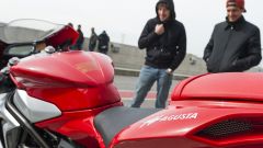 DUE PER TUTTI… O QUASI Ecco perché la MV Agusta F3 800 e la Ducati 899 Panigale vanno bene anche per chi non è proprio un pilotone da mondiale: perché sono potenti e affilate, certo, ma anche guidabili da due normali utenti. Come per esempio Riccardo Pozzoli (nelle foto, casco bianco e tuta bianca), grande appassionato di moto e ormai spostato sul genere cafè racer ma con un trascorso sportivo, e Andrea Lorini (nelle foto, casco azzurro/bianco e tuta rossa), appassionato anche lui ma che viene dal mondo dell’enduro. Quindi la sfida è servita: quattro piloti di cui due tester ufficiali, il sottoscritto e il buon Andrea Schiavina, e i due outsider Pozzoli e Lorini. Due moto, quattro piloti, quattro modi diversi di guidare. Tutto nella pista di Cremona, San Martino del Lago, teatro perfetto per la comparativa. Ma chi ha preferito quale? Navigate nello speciale per scoprirlo…