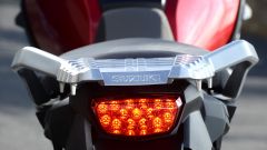 DI BENE IN MEGLIO Non appena sale la velocità, poi, questa Suzuki sfodera un bilanciamento davvero impeccabile. La fluidità con cui scende in piega è eccellente e sorprende la naturalezza con cui aiuta a individuare l’inclinazione ideale. Se da una parte l’inserimento in curva richiede pochissimo sforzo, dall’altra non si ha mai l’impressione che la moto tenda a cadere all’interno della curva e si ha sempre ampio margine per correggere di fino la traiettoria, con il gas, il freno o spostamenti misurati del corpo. L’avantreno resta sempre neutro permette di pennellare la linea ideale sull’asfalto in modo chirurgico, tanto che, dopo un po’, il rischio che si chiuda la proverbiale vena è forte: nel misto ci si trova spesso a far scorrere la moto da una parte all’altra della corsia, danzando dolcemente con un sorriso a 32 denti sotto la visiera e senza il minimo affanno.