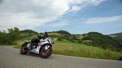 Spesso a porre fine alle “chiacchiere da bar” ci pensano i freddi numeri o, nel caso dell’Aprilia RS 660, i record: lei è la sportiva – non solo stradale – più venduta in Europa, segno che in quel di Noale oramai qualche anno fa ci hanno visto giusto. Nonostante il suo motore bicilindrico da 659 cc, 100 CV a 10.500 giri e 67 Nm di coppia derivi da quello dell’esoterica RSV4, rispetto alla SBK di casa ha una posizione di guida meno estrema, con semi-manubri sopra la piastra di sterzo e pedane più centrali. Sempre al top l’elettronica, di gran lunga la migliore del confronto, con piattaforma inerziale, cambio elettronico, anti impennata, controllo di trazione e ABS pluri regolabili con tanto di setting per l’uso in pista. La specialità della casa per il costruttore veneto è risaputo essere la ciclistica e la RS 660 tiene fede alla tradizione: telaio e forcellone sono in alluminio, freni Brembo con pompa radiale all’anteirore, forcella Kayaba da 41 mm regolabile e mono regoalbile in pre-carico ed estensione, per un peso in ordine di marcia di 180 kg, che le conferisce anche il miglior rapporto peso potenza della categoria. Aprilia per il confronto ci ha dato la versione top di gamma Extrema, che aggiunge carbonio qui e lì e toglie peso, ma si è dimenticata di rimuovere il mono Ohlins che usa per le prove in pista… che sbadati, quello non è compreso nei 13.499 euro necessari all’acquisto, ma se volete spendere meno la versione standard ha già tutto il necessario per divertirsi a 11.699 euro. Il prezzo è il più alto del confronto, ma lo è anche la dotazione, che comprende le già valide Pirelli di primo equipaggiamento.