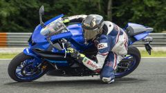 Tra i cordoli la musica cambia un po': il manubrio alto della GSX-8R dà meno feeling, le pedane basse toccano presto l'asfalto e sospensioni e ABS non stanno al passo delle più performanti. Se si frena forte la forcella si schiaccia e l'antibloccaggio ''va in panico'', entrando in funzione e allungando gli spazi di frenata (meglio togliere il fusibile dell'ABS per la guida in pista). Nel guidato la bella schiena del bicilindrico Suzuki garantisce una bella spinta, ma quando i rettilinei si estendono la mancanza di potenza agli alti si nota. La Suzuki, un po' come la Honda, è quella che più si presta ad arrivare in circuito con targa e fanali e ripartire a fine turno (o giornata) belli freschi, in direzione casa. Una vera sportiva stradale.