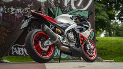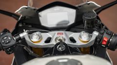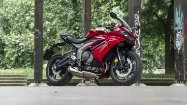 Anni a dire “Torna? Non torna? Dovrebbero farla…” ecco alla fine l’hanno fatta, forse non come gli smanettoni incalliti la sognavano ma diamo il bentornato alla Triumph Daytona, che si inserisce a gamba tesa nel segmento delle sportive stradali, con semi manubri montati sopra la piastra di sterzo, sella bassa e pedane posizionate in maniera non estrema. . La base meccanica è quella della naked Trident, ma rispetto a lei ha benficiato di importanti modifiche al motore, che ha un carattere più sportivo e maggior potenza. La scheda tecnica dice 95 CV a 11.500 giri/min (così è depotenziabile a 35 kw) e 69 Nm di coppia a 8.250 giri. Dal punto di vista dell’elettronica e degli aiuti alla guida rispondono presenti all’appello il RBW, i riding mode e il controllo di trazione – che cambia livello con i riding mode – mentre rientrano tra gli optional il cambio elettronico Triumph Shift Assist e la connettività Bluetooth. Anche dal punto di vista della ciclistica ci sono differenze rispetto alla sorella “nuda”, infatti il telaio tubolare in acciaio è simile per geometrie ma non identico, con il cannotto di sterzo più chiuso e un’interasse più compatto. Anche per lei, come per la maggior parte delle moto presenti in questo confronto, forcella Showa SFF-BP all’anteriore non regolabile e mono regolabile nel precarico molla. A frenare una massa di poco superiore ai 200 kg – 201 odm, ovvero con il serbatoio da 14 litri riempito al 90% - arriva un nuovo impianto frenante Nissin, con all’anteriore pinze ad attacco radiale e tubi in treccia, per garantire maggior resistenza all’affaticamento; gli pneumatici di primo equipaggiamento sono i nuovi Michelin Power 6, new entry nella gamma sportiva del costruttore francese, nelle canoniche misure 120/70 e 180/55. Il suo prezzo di listino è di 9.795 euro.