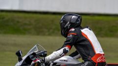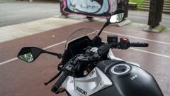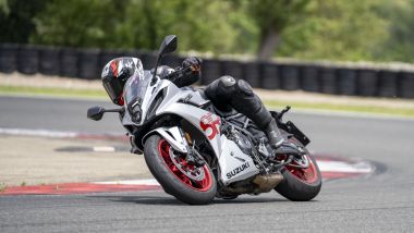 L'impostazione della RS 660 è sportiveggiante ma non troppo estrema: non è tra le più comode ma, anche durante il nostro trasferimento da Milano a Varano de' Melegari, non è risultata mai affaticante. Le pedane non sono altissime, piuttosto sono strette, per guadagnare luce a terra senza sacrificare troppo il comfort (almeno per chi è alto circa 180 cm). Il motore bicilindrico non è il più pronto sotto – al contrario di quello Suzuki – e ha un carattere tutto suo: suona quasi come un V4 ed è capace di allungare – ed esaltare – al salire di giri, complice anche il cambio quickshifter che lavora benissimo. Tra le curve l'Aprilia fa assaggiare sensazioni da sportiva vera e non può che venir voglia di portarla tra i cordoli...