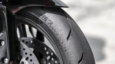 Michelin Power GP2, proprio come il suo predecessore, è uno pneumatico pensato per l’uso su strada e pista in egual misura. Rispetto al passato cambia drasticamente il disegno del battistrada, ora decisamente più aggressivo e con tanta spalla slick, pur mantenendo un rapporto vuoti/pieni del 6,5% (le gomme racing street arrivano al 4%). A livello tecnico, Michelin conferma alcune sue soluzioni tecniche più all’avanguardia, come la tecnologia 2CT+ al posteriore - dove la mescola più ricca di silice va a infilarsi al di sotto di spalle rinforzate con carbon black - o alla struttura della carcassa Radial-X evo, con tele in aramide, con vantaggi in termini di leggerezza. Lo scopo di queste soluzioni è ottenere una migliore aderenza su bagnato, su asciutto e ottimizzare l’handling, ma anche una migliore resa chilometrica. Stabilire quanti chilometri possono essere percorsi con questa tipologia di pneumatici può essere difficile, utilizzo strada/pista e tipologia di moto possono influenzare molto il risultato finale, ma una stima plausibile (senza esagerare con la pista) è attorno ai 6.000 km.