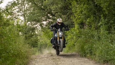 Sa far divertire su strada? La risposta è sì. La Scrambler, con quel manubrio bello largo, dà un gran feeling soprattutto nello stretto, dove risulta facile da manovrare e agile, ma non mostra il fianco quando c’è da fare qualche bel curvone a velocità sostenuta, e il carattere del motore si sposa sia alla guida in relax, sia a qualche bella tirata, con medi convincenti. Il setting morbido mi piace su una scrambler, lo trovo giusto per un po’ tutte le situazioni, dall’asfalto rotto ai dossi delle città, per finire al fuoristrada leggero. E se poi le condizioni dovessero migliorare bastano due click e iL gioco è fatto.