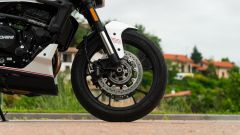 Per la massima versatilità, non c’è nulla di meglio di una stradale di media cilindrata. Com’è, per esempio, la Morini Seiemmezzo STR… che sta per Street, naturalmente. Tra le curve, come sul pavé, le gomme stradali danno rigore e sicurezza: più del tassello, di cui francamente non capisco fino in fondo la moda. Anche perché, quando si tratta di frenare forte come possono i Brembo della Morini, un battistrada come quello delle Pirelli Angel GT che trovo qui ti dà molto più affidamento di una gomma per uso promiscuo.