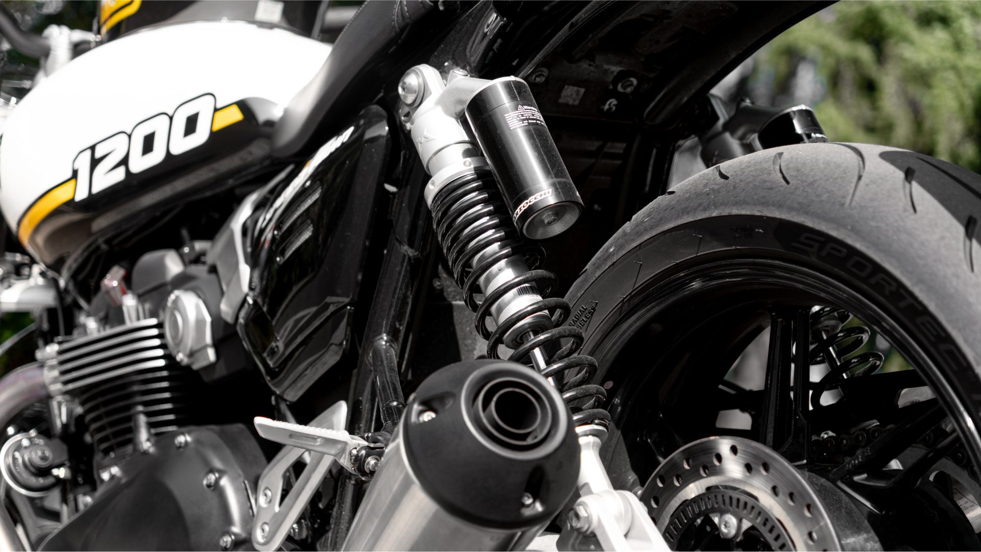 Al netto di queste osservazioni, la Speed Twin come vi dicevo ha le carte in regola per dar filo da torcere a moto appartenenti a segmenti più affini alla guida sportiva. Il merito è da suddividere tra motore e ciclistica, con il primo a vincere l’Oscar come miglior attore protagonista. Il bicilindrico parallelo frontemarcia High Power da 1.200 cc incrementa il picco di potenza salendo fino a 105 CV a 7.750 giri/min e conferma i 112 Nm a 4.250 giri/min. Telaio ed ergonomia hanno subito piccole variazioni, con il primo più rigido nella zona del cannotto di sterzo, e il triangolo ergonomico punta a fornire maggior comfort e controllo, almeno sulla versione base. Le sospensioni Marzocchi prevedono una forcella USD davanti e una coppia di ammortizzatori regolabili nel precarico al posteriore. I 216 kg in ordine di marcia sono frenati da pinze anteriori radiali Triumph (in realtà J.Juan, come la pompa freno) che mordono dischi da 320 mm, quello posteriore è da 220 mm con pinza flottante Nissin.