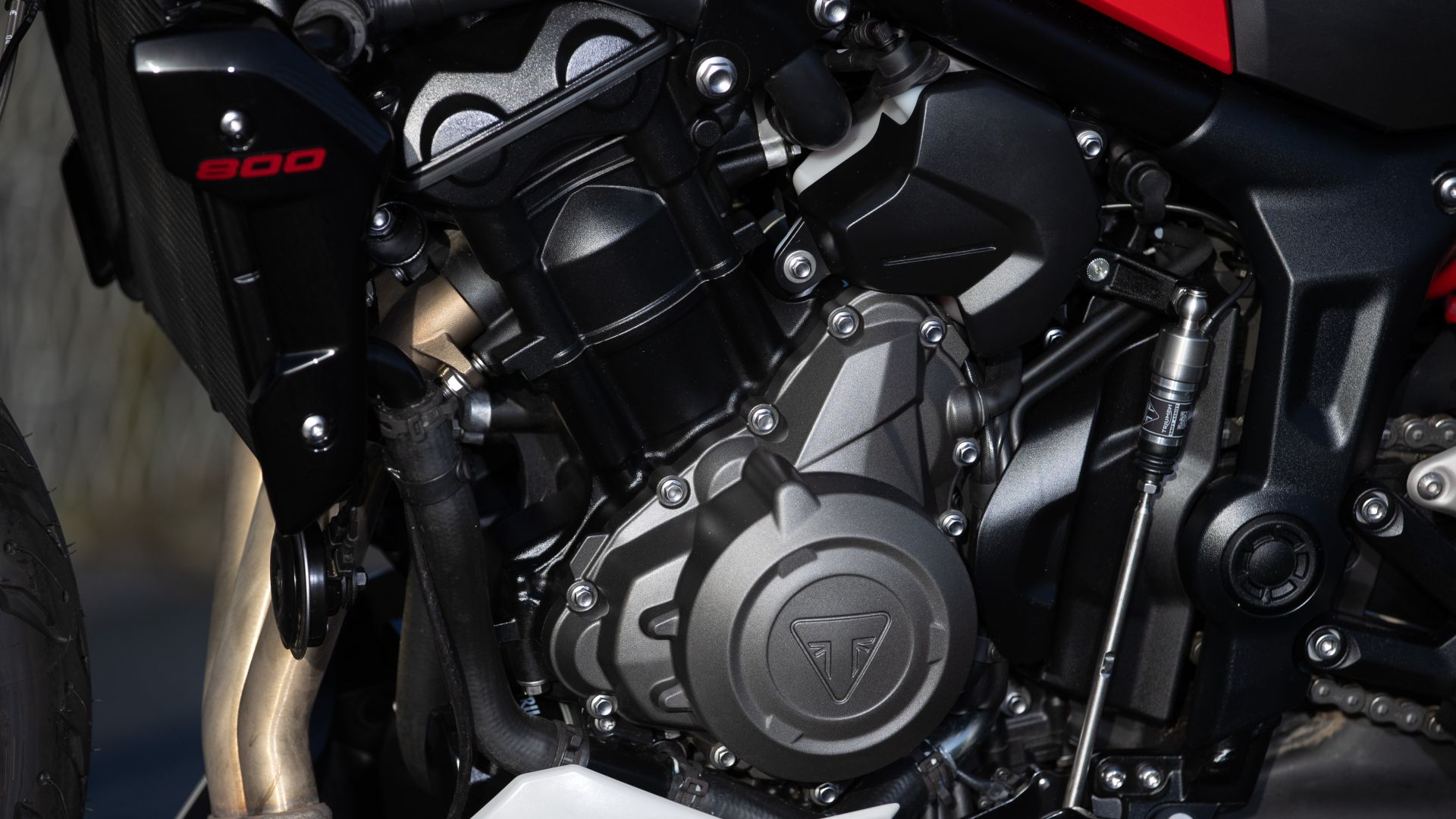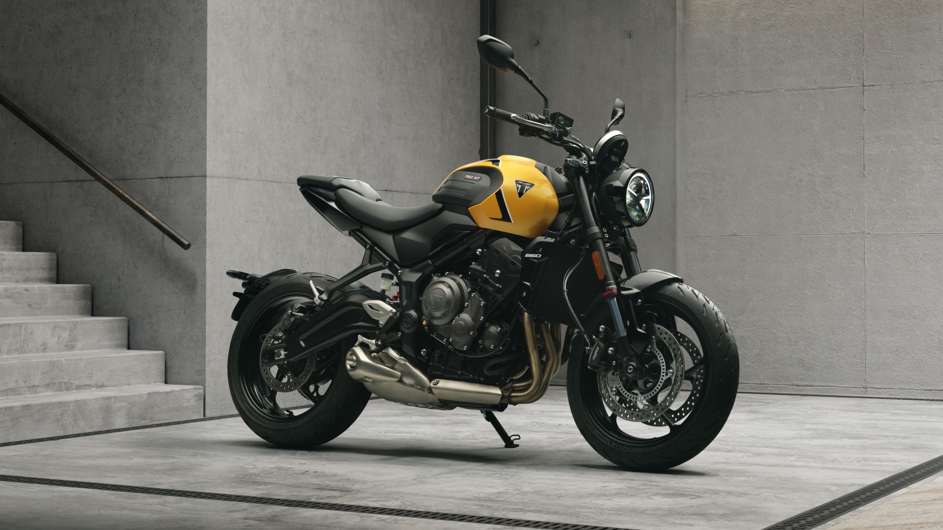 Per distinguere a colpo d'occhio Trident 800 dalla 660 – colori a parte – bastano pochi particolari: la sorella maggiore vanta un mini cupolino e un grande scarico che si sviluppa lateralmente (non sotto il motore, come sulla 660). Dal punto di vista strettamente tecnico, motore a parte naturalmente, anche l’impianto frenante anteriore è differente: sulla piccola, infatti, sono montate pinze ad attacco assiale.