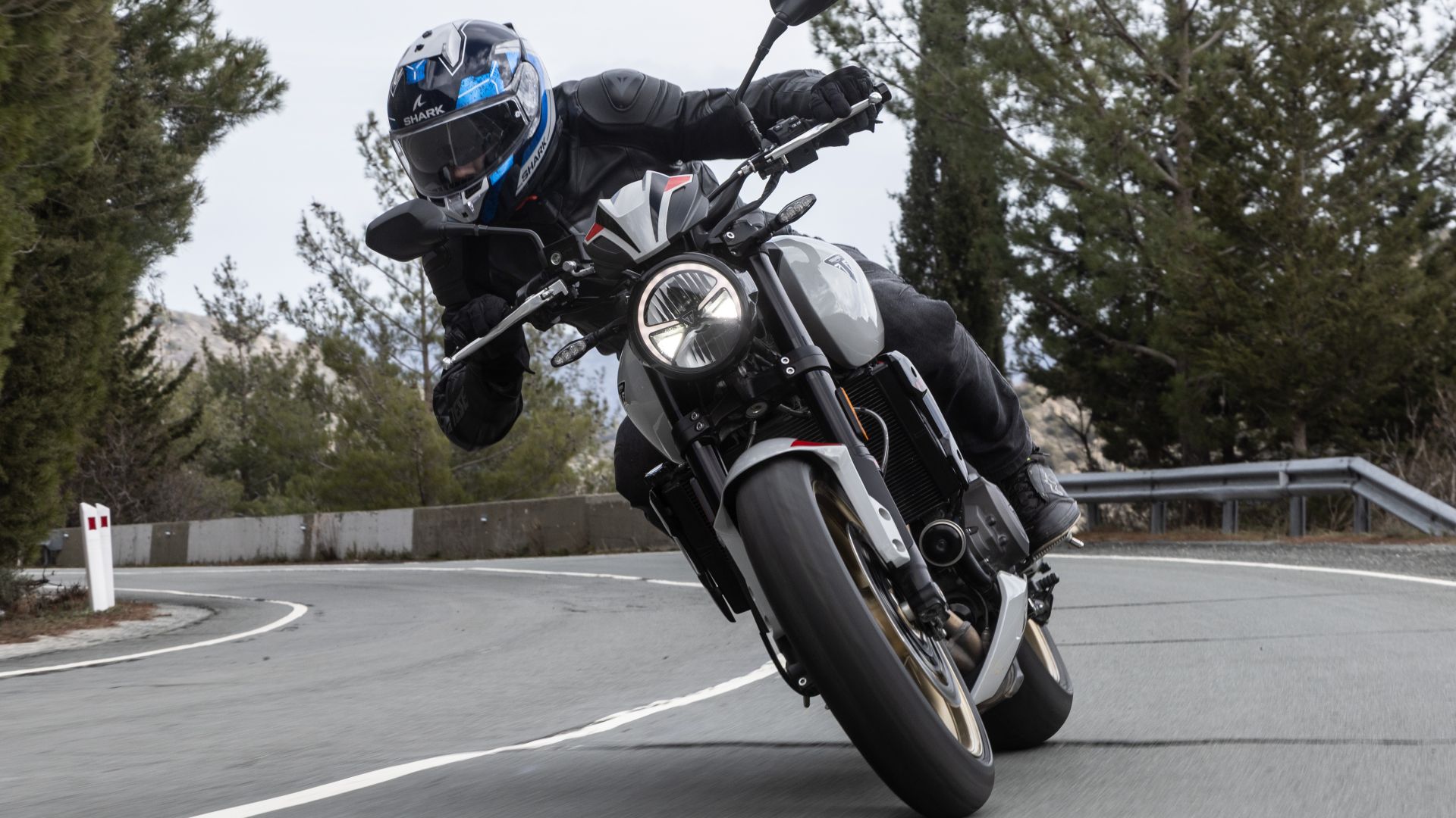 Nella guida su strada, esaurita la questione motore-cambio, ci sono aspetti molto buoni ed altri un poco meno. Le sospensioni, che da fermo sembrano evidenziare un’eccessiva cedevolezza, mostrano un buon compromesso una volta in azione, che si tratti di città o misto lento/veloce. Dossi e avvallamenti non le mettono in crisi – certo, il mono risulta un po’ secco se si esagera – ma nemmeno la guida a passo svelto le impensierisce: la Trident si dimostra bella agile – non sembra granché inferiore alla vecchia 660 – ma anzi più stabile, sul binario. Il manubrio largo aiuta, soprattutto nello stretto, il resto lo fa la sana ciclistica (che poi l’assetto è in buona parte regolabile).
