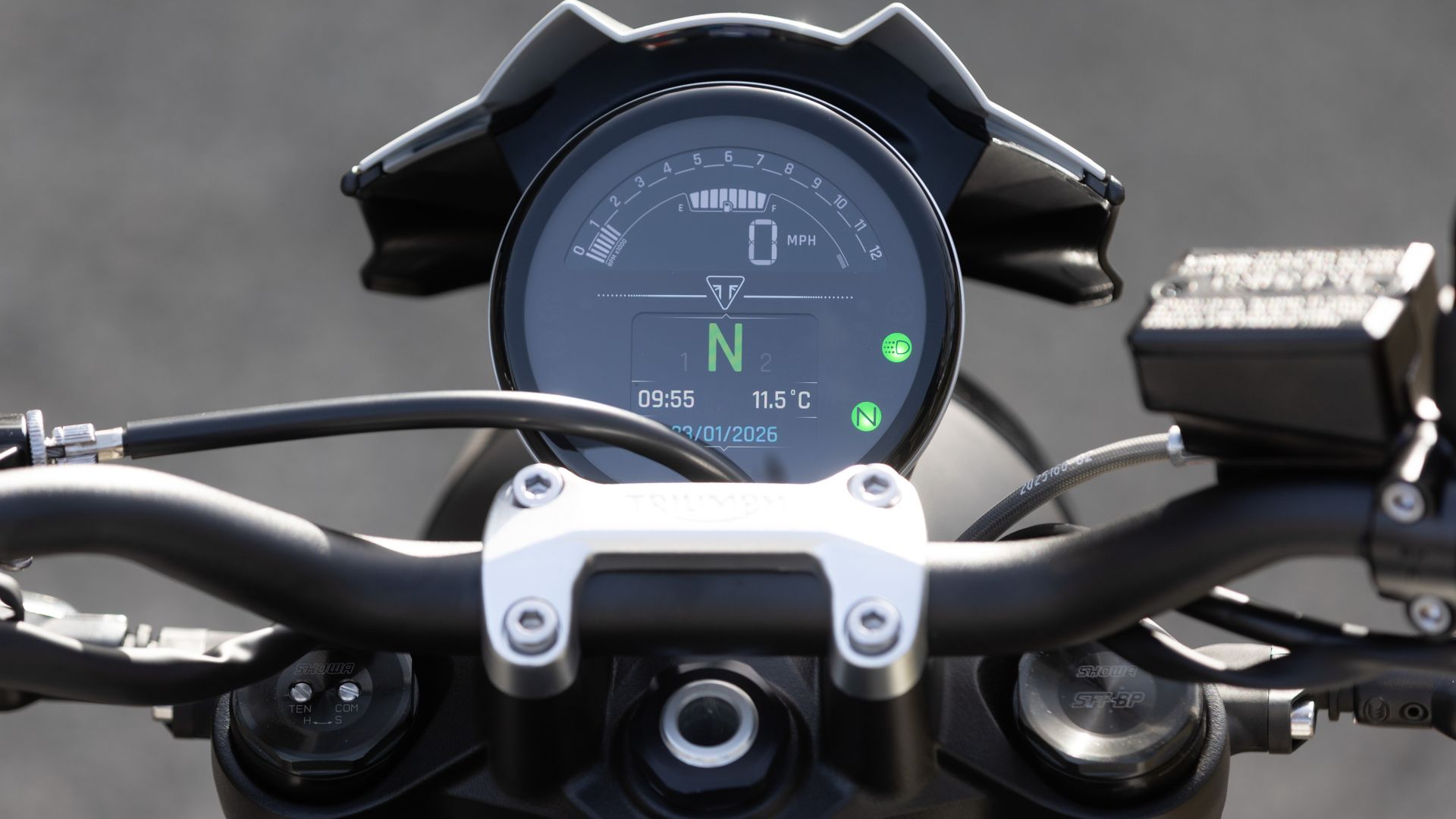 L’elettronica della Trident 800 è semplice: ci sono comunque ABS e Traction Cornering, 3 Riding mode – no mappa personalizzabile – un cruise che funziona acceso/spento – senza possibilità di salire o scendere di velocità, ma solo di fissarla – e non ultimo un piccolo display LCD con TFT, tondo, che si sposa molto bene col look un po’ retrò della moto ma certo può risultare sottotono rispetto alle strumentazioni-tablet che si vedono oramai in giro. In merito al funzionamento dei controlli di sicurezza, gli unici che reputo davvero importanti, l’ABS mi è parso delicato nel suo intervento, mentre il controllo di trazione è entrato in funzione solo una volta, tagliando in modo molto smooth (per dirla all’inglese maniera).