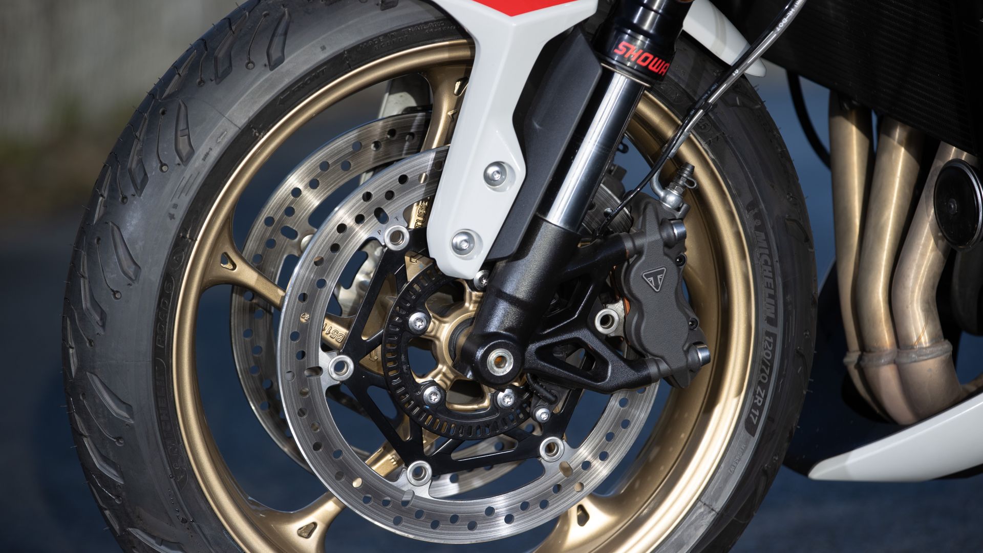Ve l’abbiamo già raccontata in lungo e in largo la nuova Trident 800 – qui il nostro video/articolo – ma facciamo un breve riepilogo. Il cuore è il 3 cilindri da 798 cc montato sulla Tiger Sport 800: da 115 CV a 10.750 giri/min e 84 Nm a 8.500 giri/min valori tali e quali a quelli della crossover. Telaio e forcellone in acciaio lavorano con sospensioni Showa: una forcella regolabile in compressione ed estensione, un mono regolabile in precarico ed estensione (come su Tiger Sport 800). E indovinate un po’? Le pinze ad attacco radiale marchiate Triumph – by J.Juan – che mordono dischi da 310 mm sono anche esse come quelle della cugina crossover.