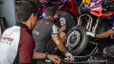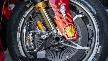 I numeri forniti da Brembo raccontano una tecnologia portata all’estremo. L’impianto frenante di una MotoGP pesa appena 2,3 kg, con oltre due terzi imputabili ai dischi in carbonio. Le 15 varianti di dischi disponibili condividono uno spessore di soli 8 mm, mentre i diametri anteriori arrivano fino a 355 mm, misura obbligatoria in alcune piste particolarmente impegnative. Impressionano anche i picchi di prestazione: a Barcellona la pressione in frenata raggiunge i 14,4 bar, mentre a COTA servono 6,5 secondi pieni per ridurre la velocità da 334 a 69 km/h. Il range di temperatura ideale dei dischi varia tra 250 e 850 °C, ma in casi limite può sfiorare i 1000 °C.