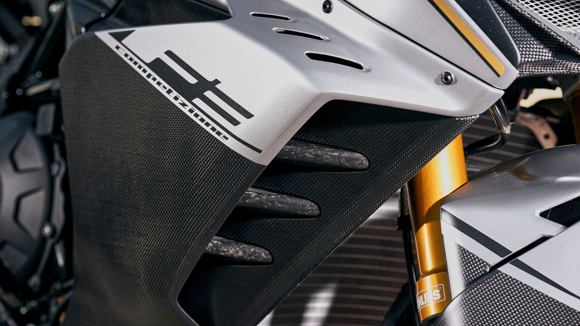 Bella è bella, anzi bellissima: come ti aspetti da una MV, ma ciò che rende speciale la Competizione è in primo luogo l'asticella che si alza sul fronte della componentistica, e che fa calare, nel contempo, la lancetta della bilancia. Le ruote in carbonio tagliano tre chili dal peso complessivo dove conta di più, per una guida rivoluzionata rispetto alla F3 RR; Ohlins firma le sospensioni e un altro chiletto guadagnato,con la forcella NIX30 e il mono TTX 36, a cui si aggiunge l'ammortizzatore di sterzo regolabile su 19 posizioni, che sulla F3 RR da cui deriva non c'è proprio). Tre chili se ne vanno grazie allo scarico completo in titanio firmato Akrapovic e altrettanti grazie alla compatta batteria al litio. Se poi smontiamo specchi e portatarga, con indicatori di direzione annessi, si arriva a 178 kg con tutti i liquidi (ma il serbatoio vuoto): un dato vicino a quello della potenza massima. Naturalmente non mancano freni Brembo (Stylema, davanti) che lavorano su due dischi da 320 mm all'anteriore un disco singolo da 220 mm al posteriore. Da notare che il mono Ohlins permette la regolazione dell'altezza del posteriore, per le più ampie possibilità di regolazione della ciclistica.