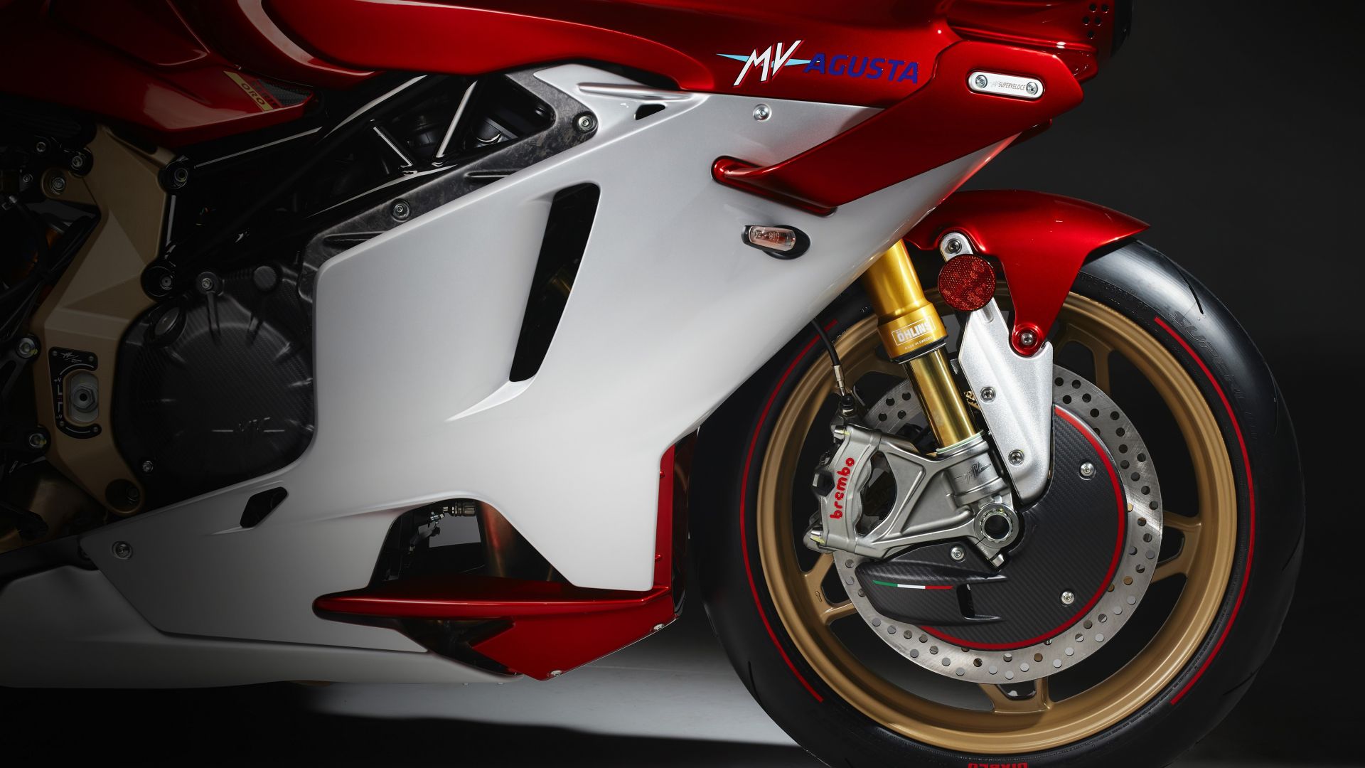 Il telaio fa capire subito che si tratta di una MV Agusta, con il traliccio in acciaio completato posteriormente dalle piastre fuse in alluminio e dalla sospensione monobraccio, con il fulcro del forcellone regolabile. Qui, per la prima volta, il mozzo della ruota posteriore ha un tappo che reca lo stemma della casa di Schiranna: un particolare distintivo e ritenuto di gran classe dagli uomini MV, ispirato al mondo automotive. Forcella e mono sono firmati Ohlins e hanno la regolazione elettronica dell'idraulica, mentre il precarico è ancora a regolazione manuale. Elettronica anche la regolazione dell'ammortizzatore di sterzo.
