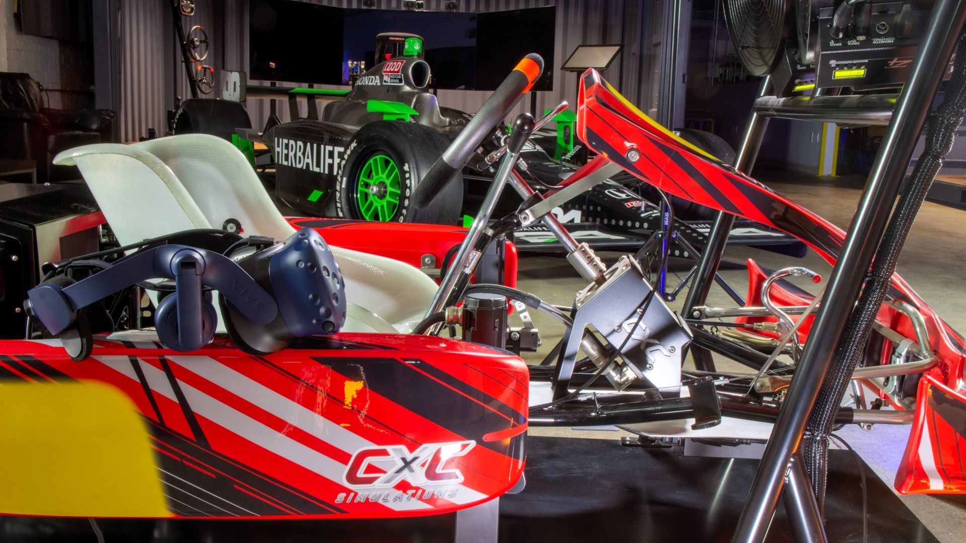 Il visore HTC Vive VR del CXC Simulations Full Motion Kart Simulator