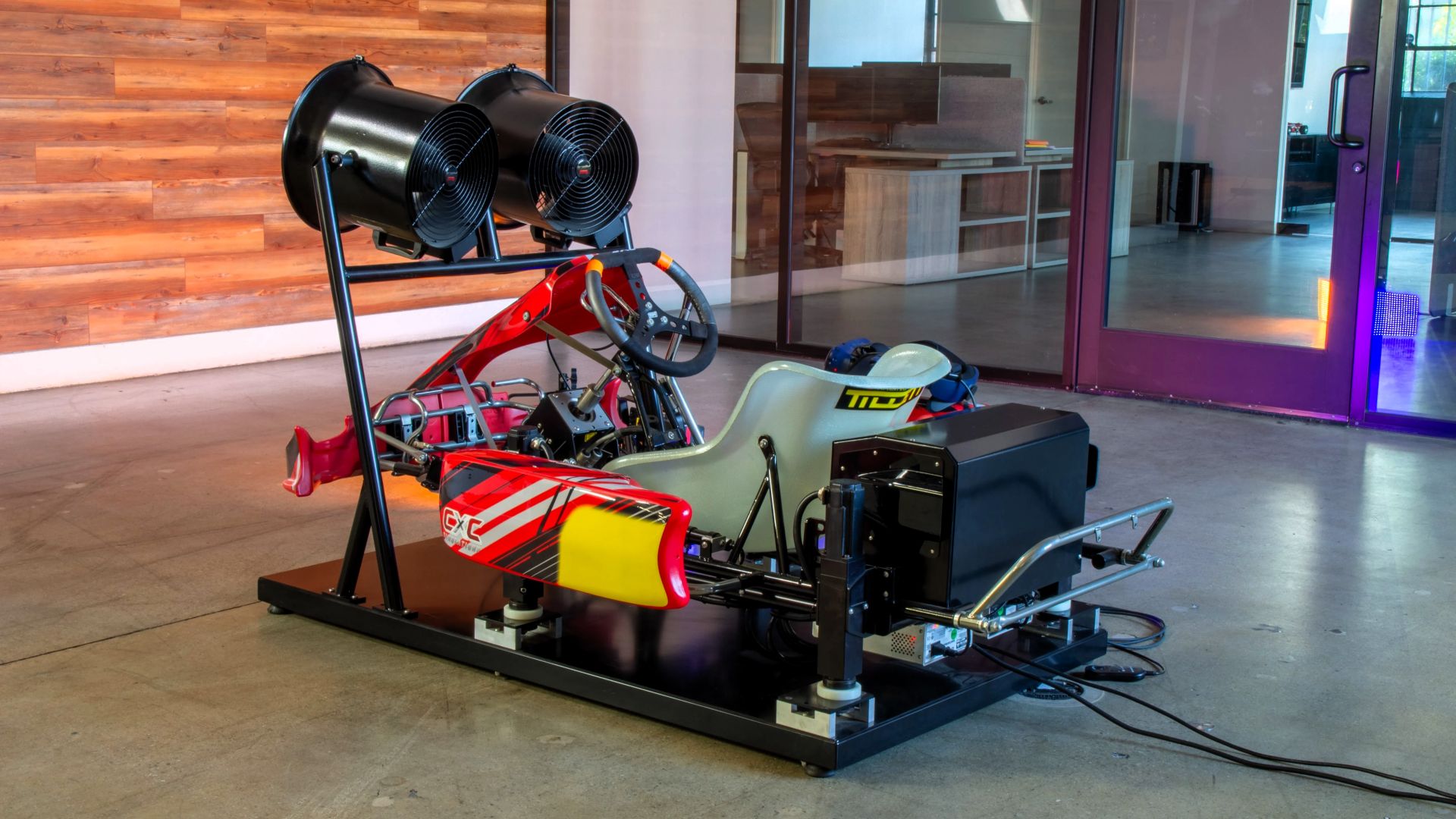 Per non farsi mancare nulla, il simulatore di karting delle foto ha due potenti ventilatori montati davanti, che trasmettono la sensazione fisica del vento sulla tuta