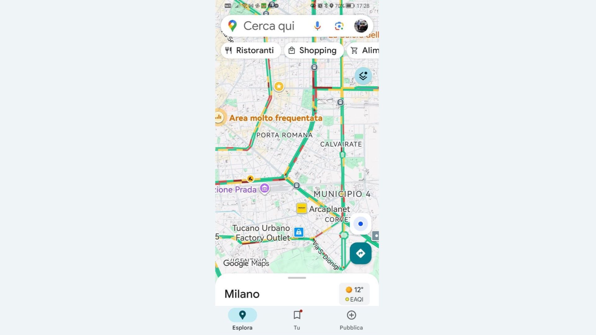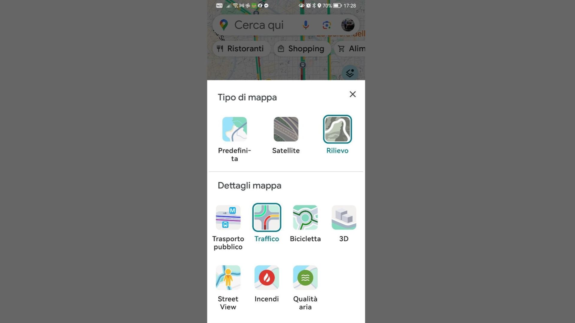 Attiva “Traffico” e la mappa si colora: verde se scorre tutto, arancione se inizia a rallentare, rosso quando è congestionato. Zoomando indietro capisci subito dove si stanno formando le code, stringendo l’inquadratura puoi individuare l’incrocio critico.
